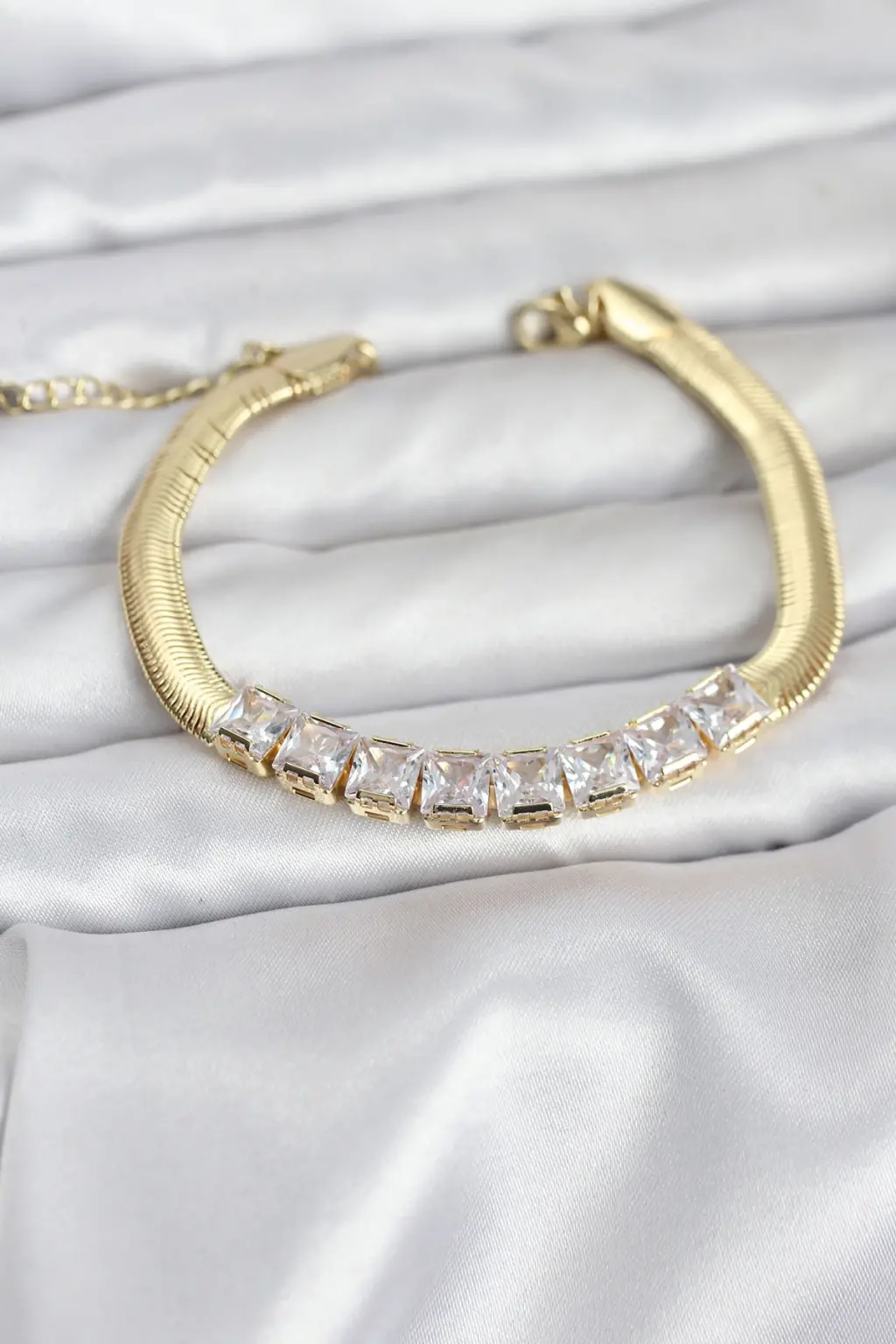 Gleam 316L Çelik Gold Renk Kare Zirkon Taşlı Yılan Zincirli Kadın Bileklik, şıklığı ve zarafeti seven kadınların vazgeçilmezi olacak!