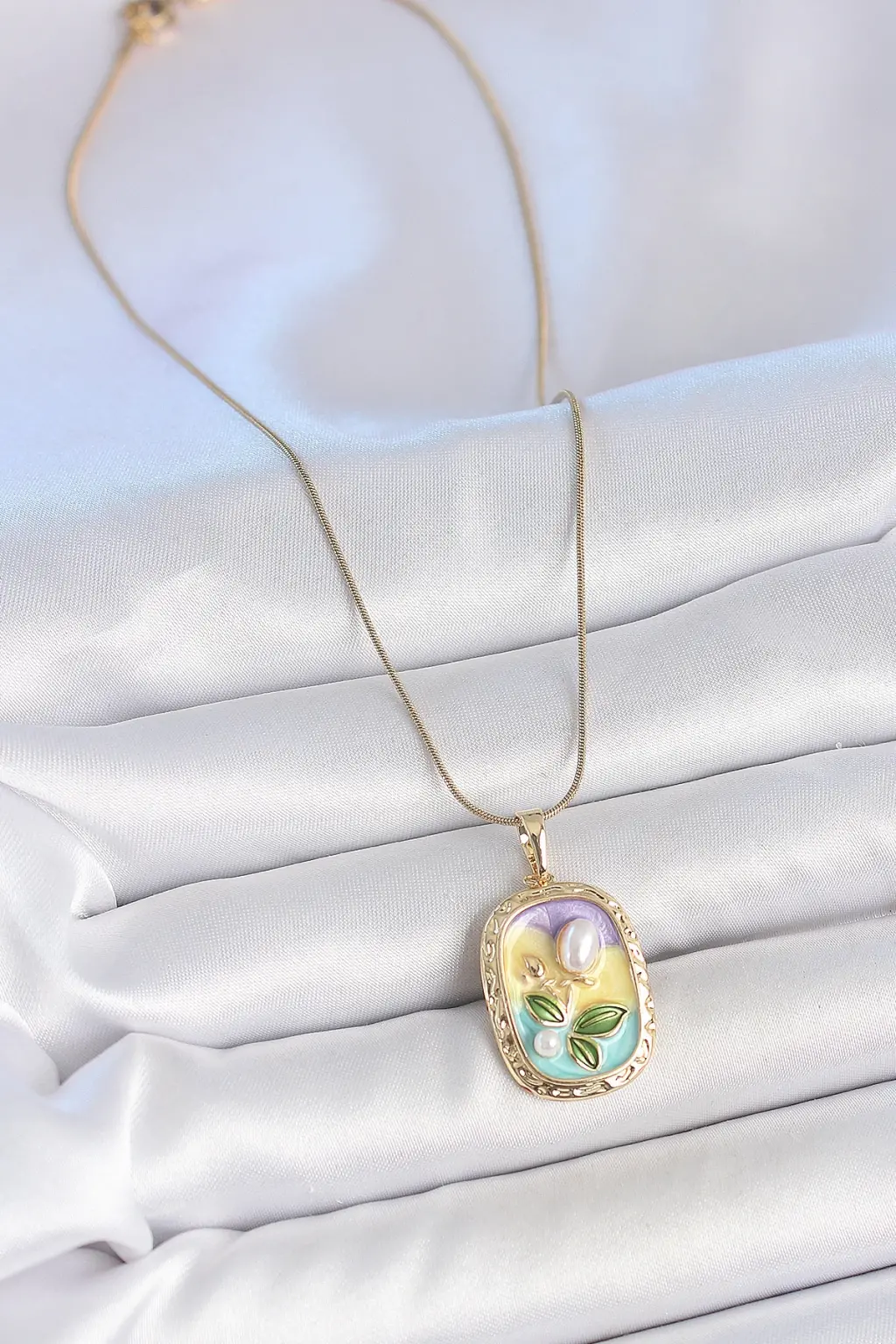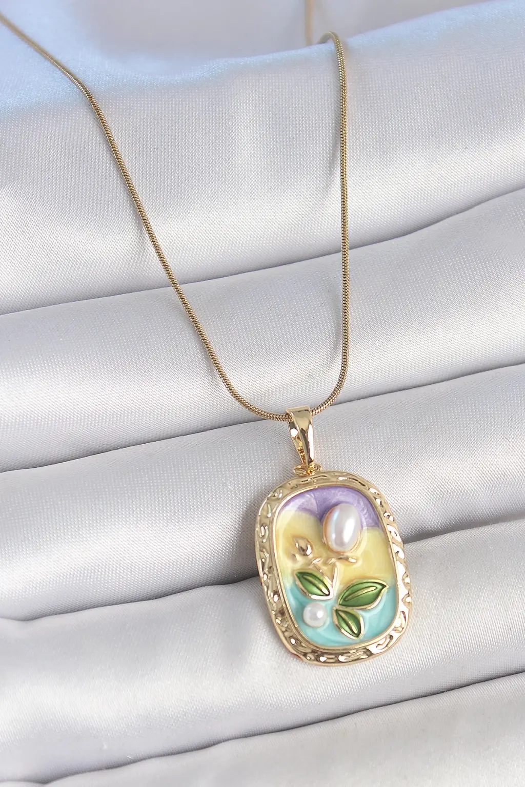 316L Çelik Gold Renk Zincir İncili Çiçek İşlemeli Portre Model Kadın Kolye özel tasarım