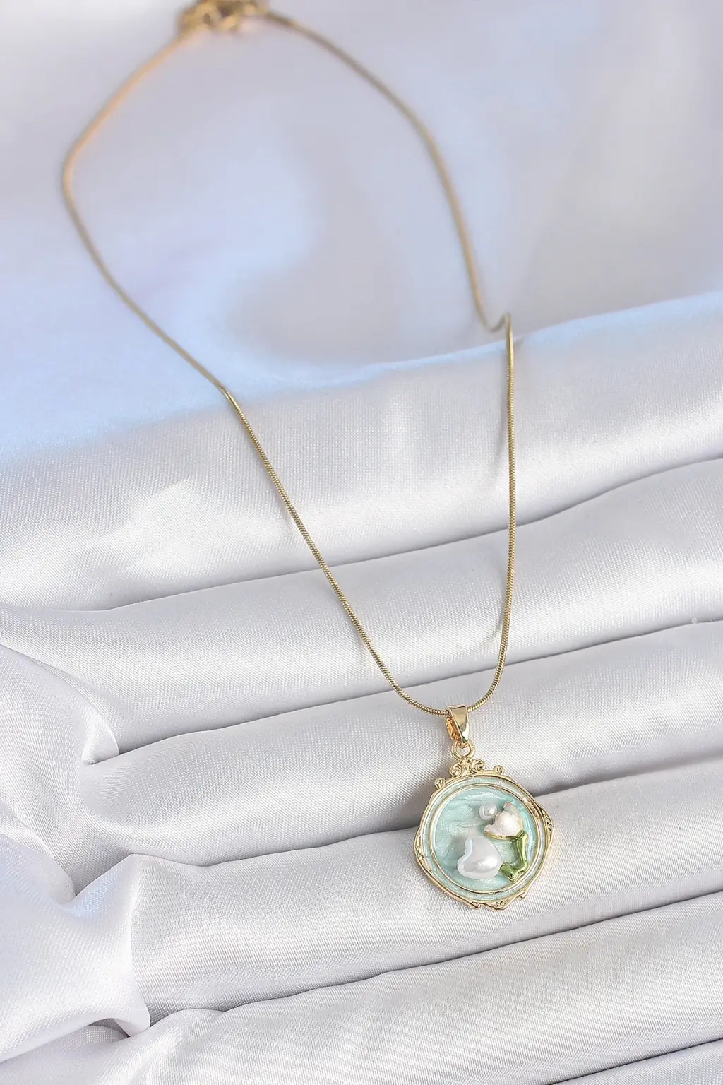 316L Çelik Gold Renk Zincir Turkuaz Mineli İncili Çiçek İşlemeli Portre Model Kadın Kolye özel tasarım