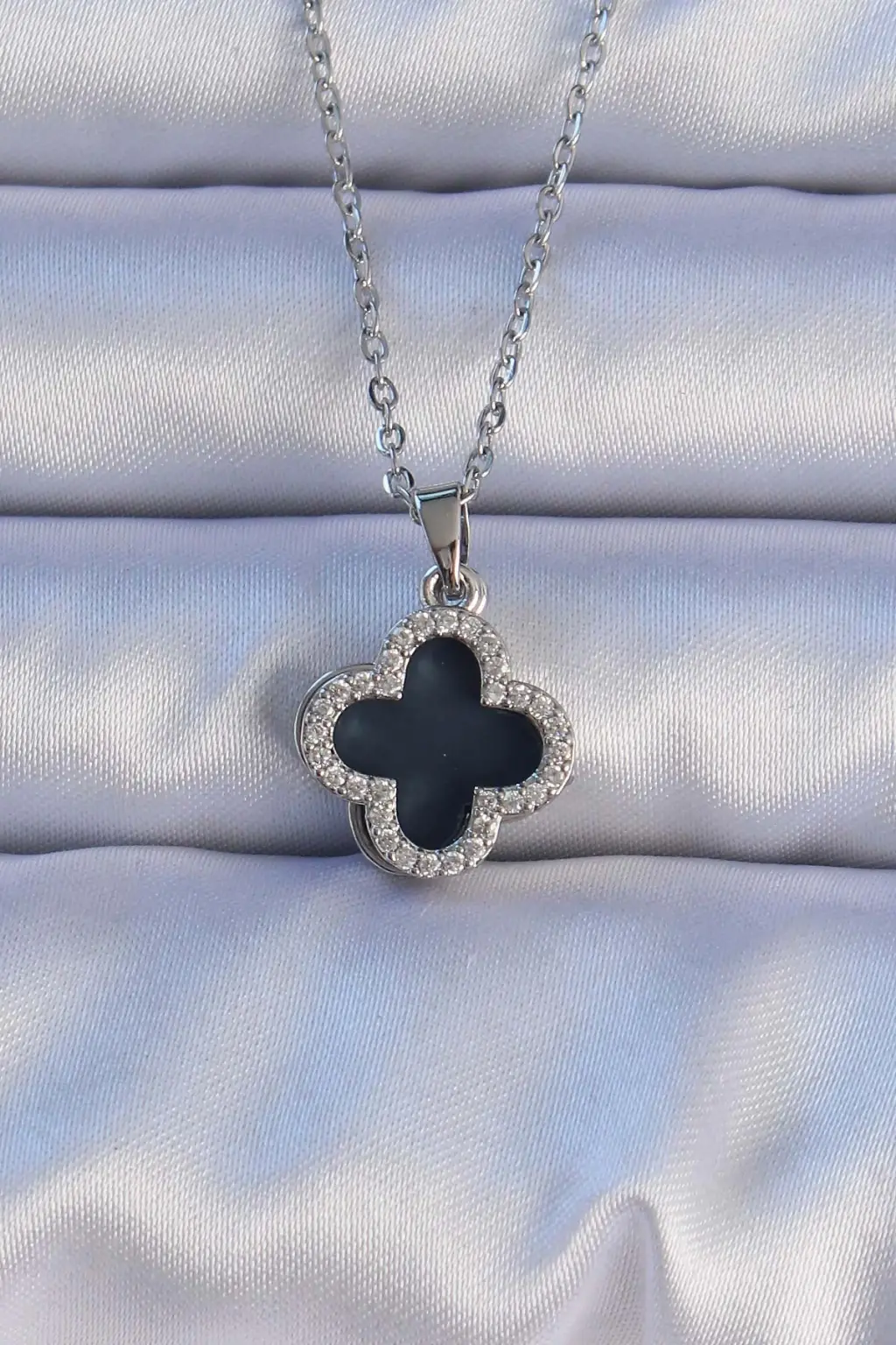 Gümüş Siyah Mineli Zirkon Taşlı Yonca Figürlü Çelik Kolye özel tasarım