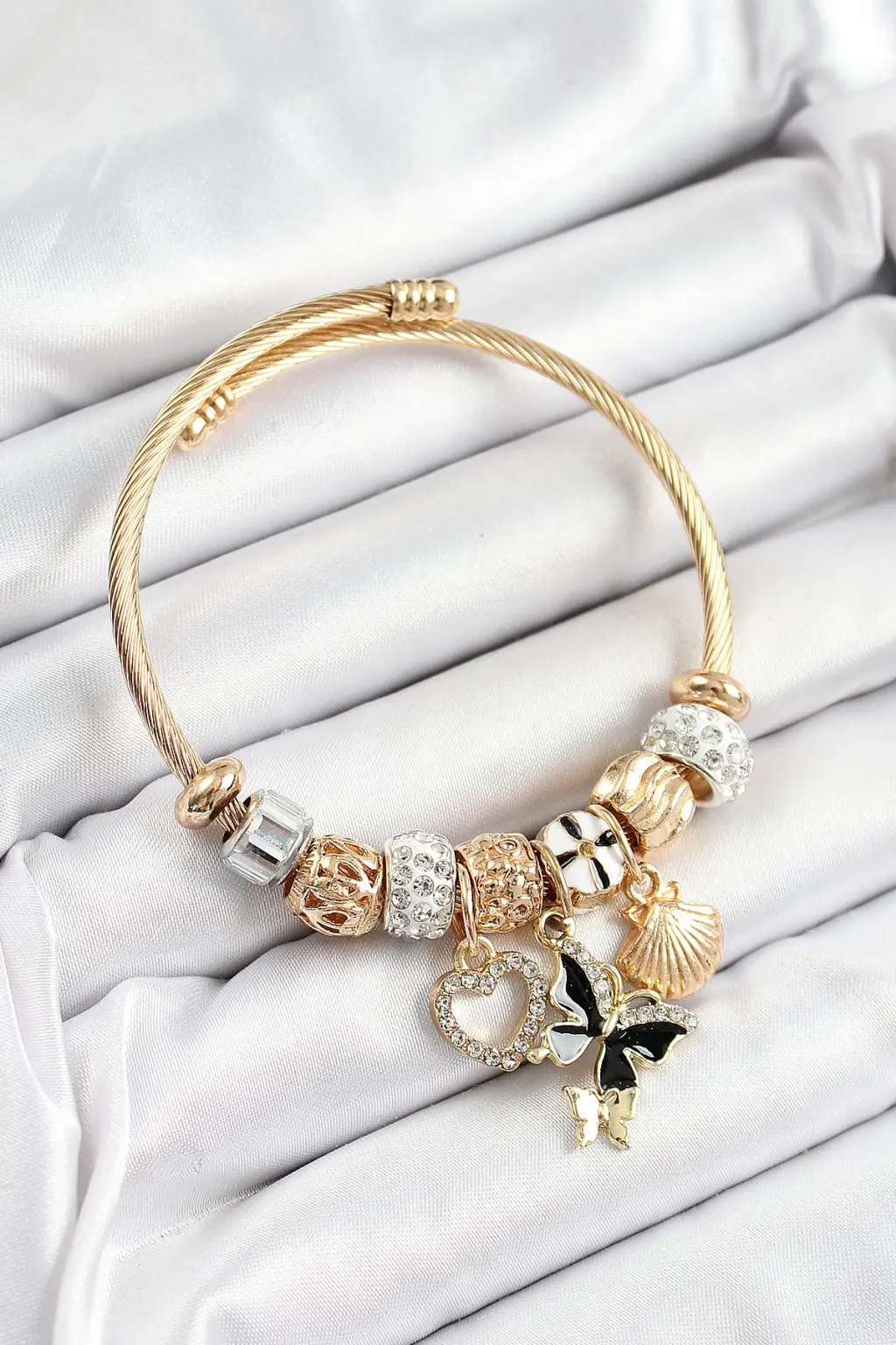 316L Çelik Siyah Zirkon Taşlı Kalp Kelebek Ve İstiridye Model Gold Renk Charm Bileklik Eşşiz tasarımıyla sizlerle. En uygun fiyat garantili kararmaz modelimiz karşınızda.