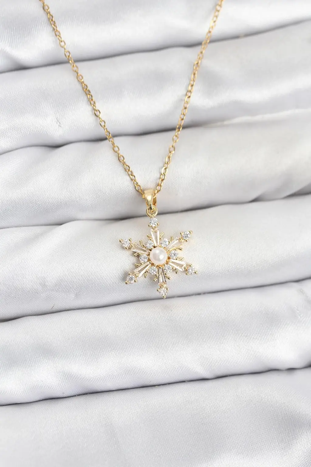 316L Çelik Zincir Gold Renk Kar Tanesi Model Zirkon Taşlı Kadın Kolye Eşşiz tasarımıyla sizlerle. En uygun fiyat garantili kararmaz modelimiz karşınızda.