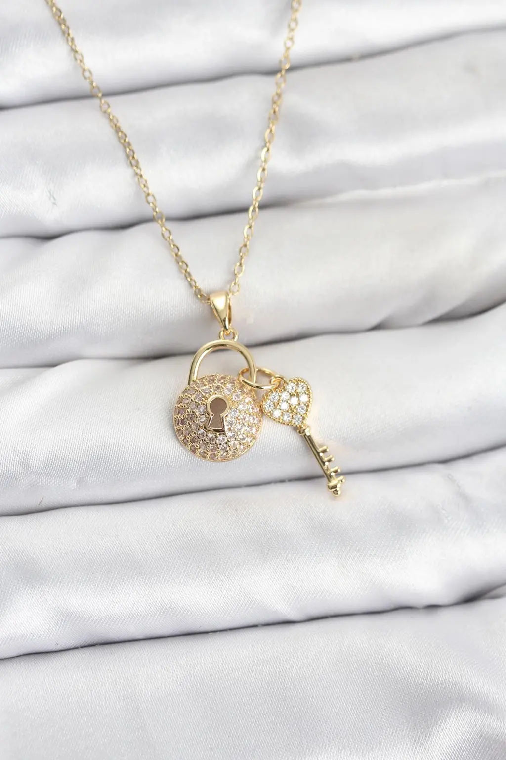 316L Çelik Zincir Gold Renk Kilit Anahtar Model Zirkon Taşlı Kadın Kolye Eşşiz tasarımıyla sizlerle. En uygun fiyat garantili kararmaz modelimiz karşınızda.