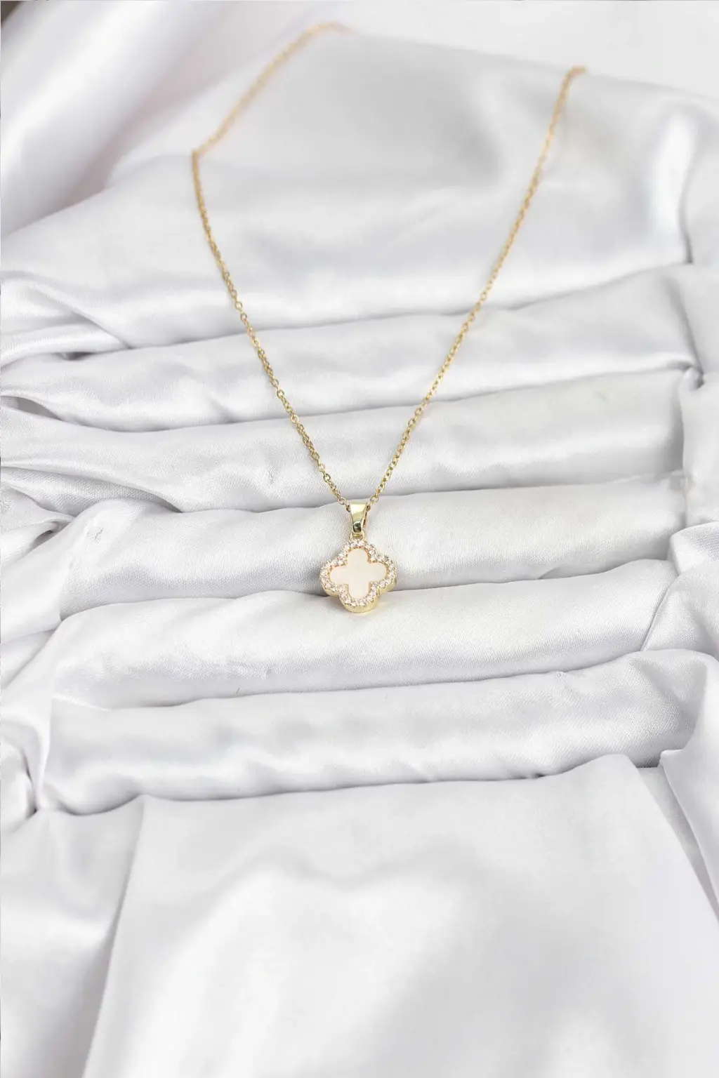 316L Çelik Zincir Gold Renk Sedefli Yonca Kadın Kolye Eşşiz tasarımıyla sizlerle. En uygun fiyat garantili kararmaz modelimiz karşınızda.