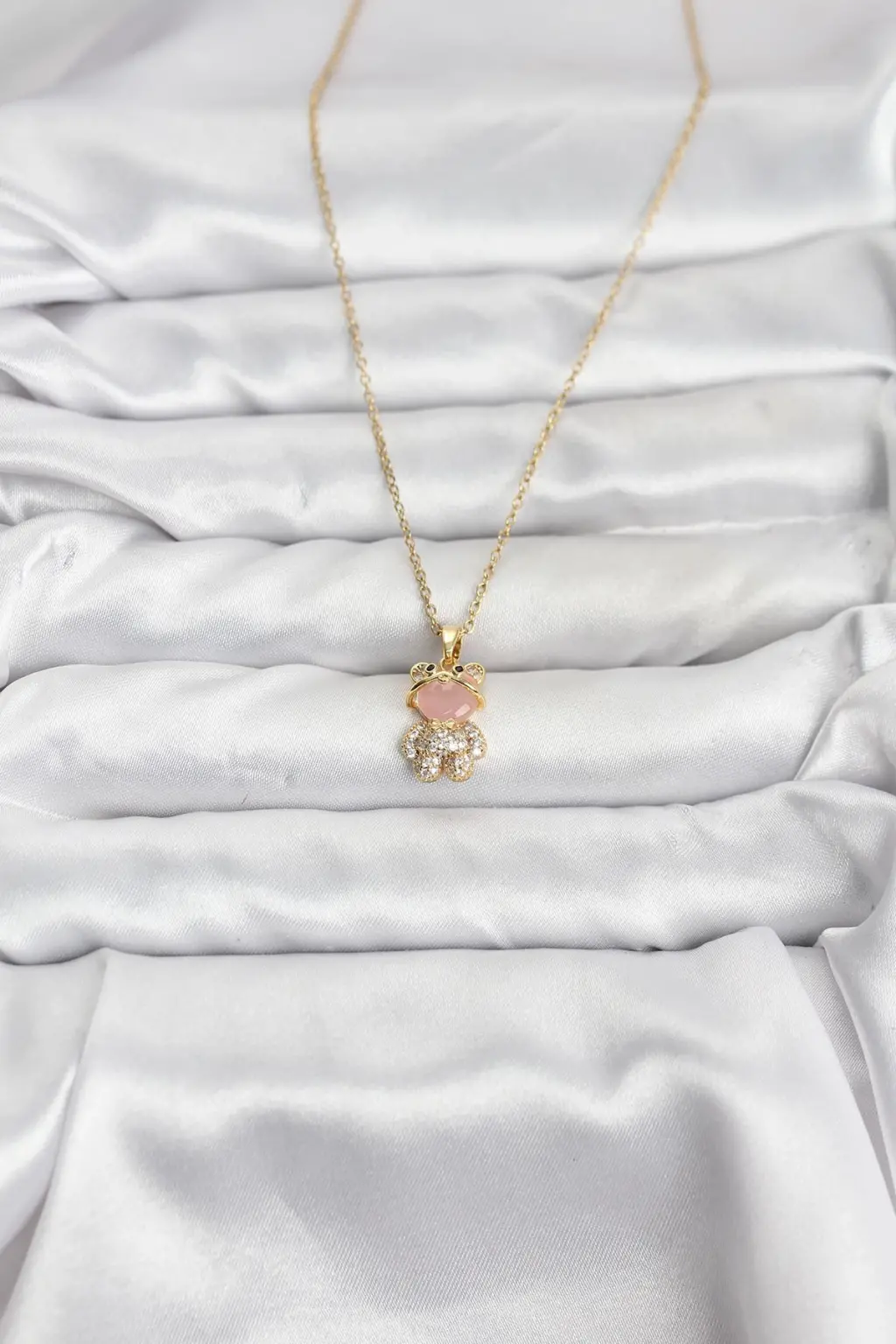 316L Çelik Zincir Gold Renk Teddy Bear Model Zirkon Taşlı Kadın Kolye Eşşiz tasarımıyla sizlerle. En uygun fiyat garantili kararmaz modelimiz karşınızda.