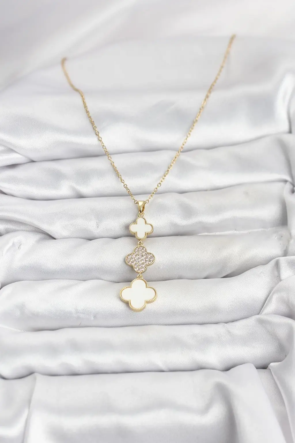 316L Çelik Zincir Gold Renk Yonca Detaylı Zirkon Taşlı Kadın Kolye özel tasarım