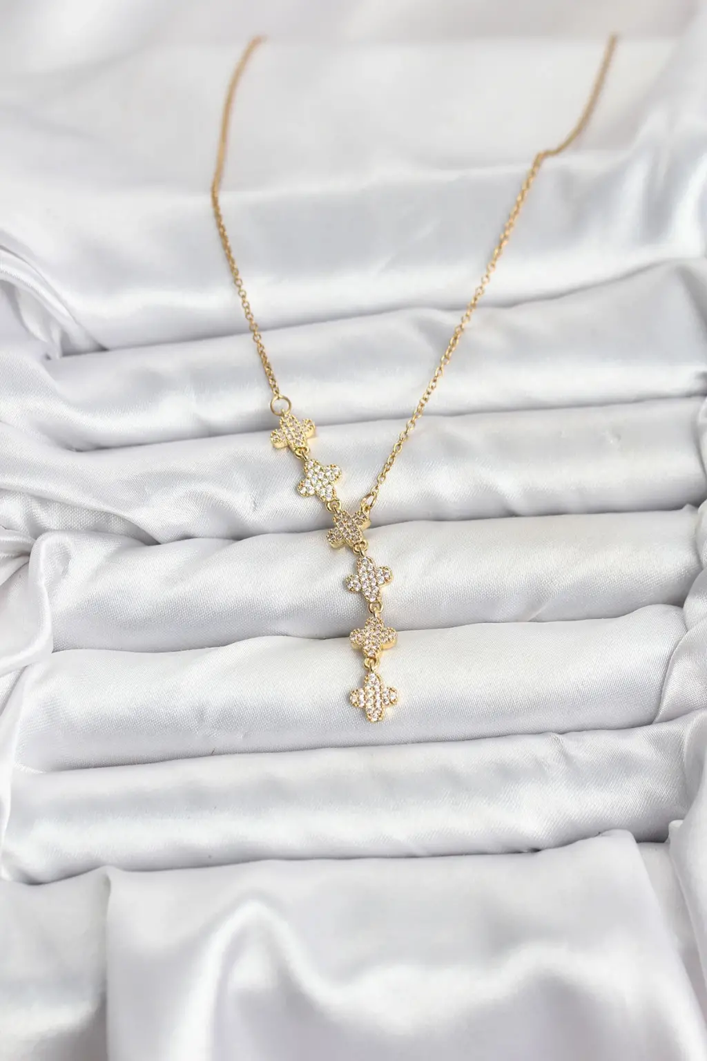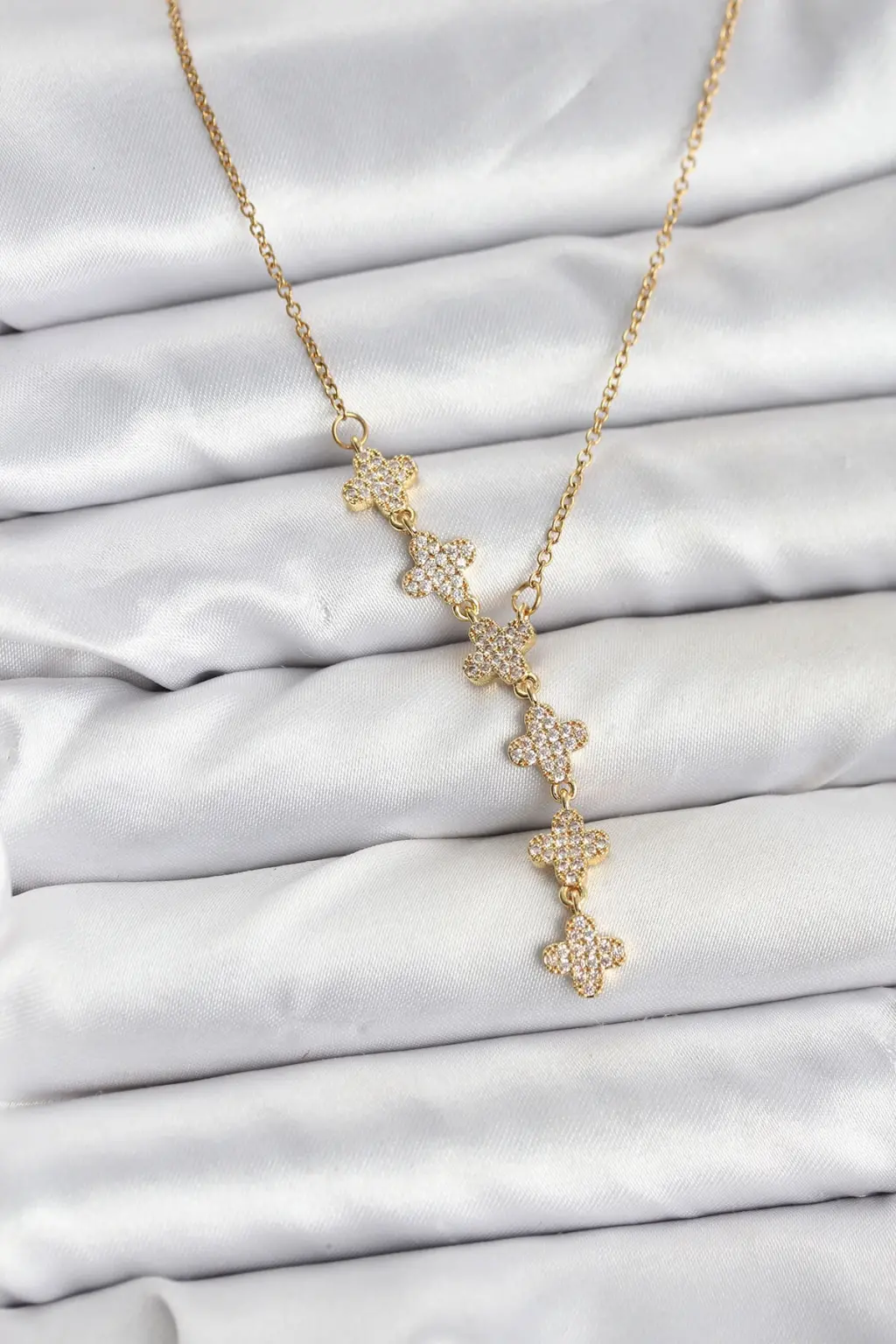 316L Çelik Zincir Gold Renk Yonca Model Kadın Kolye Eşşiz tasarımıyla sizlerle. En uygun fiyat garantili kararmaz modelimiz karşınızda.