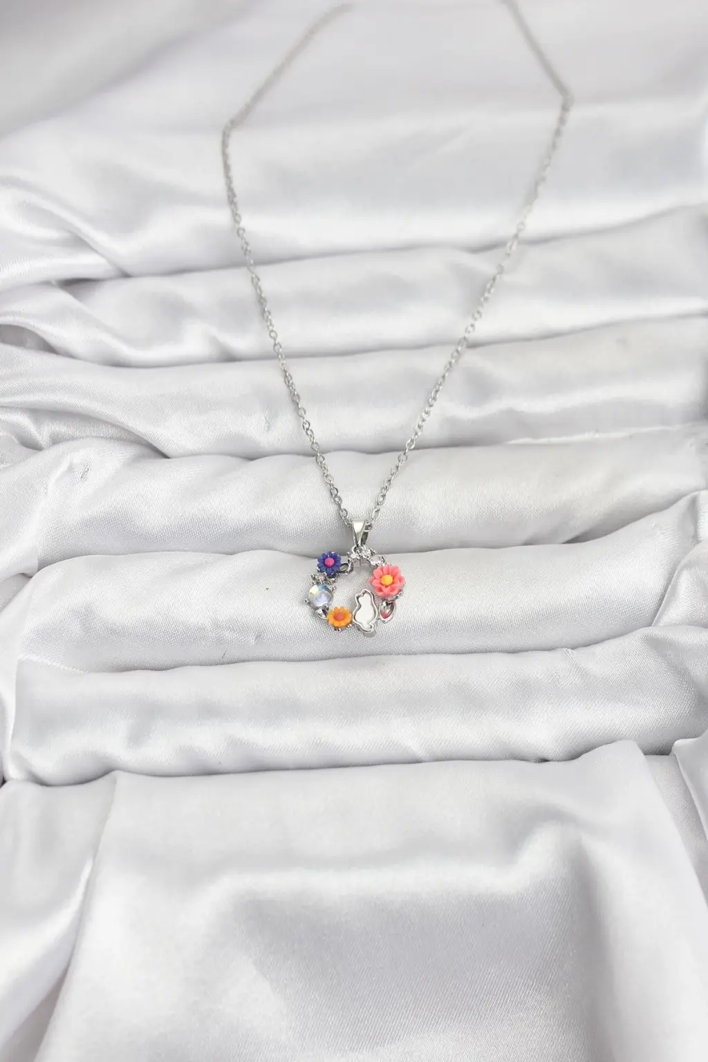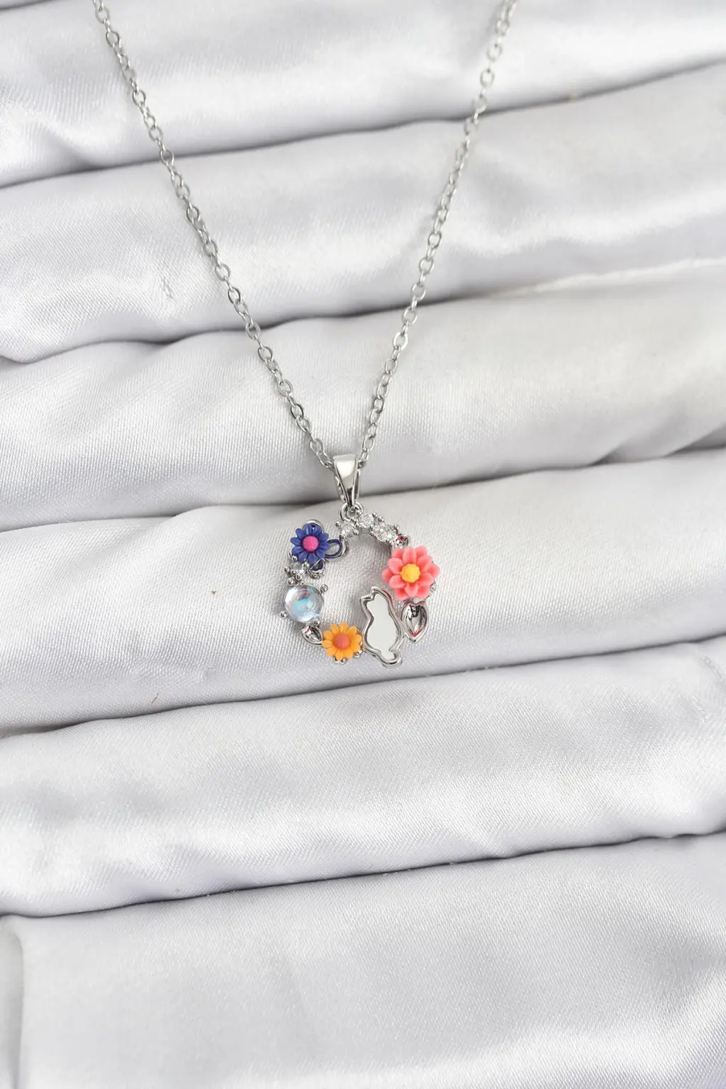 316L Çelik Zincir Gümüş Renk Çiçekli Kedili Model Kadın Kolye, şıklığı ve zarafeti bir arada sunuyor. Gleam markasıyla özel olarak tasarlanan bu kolye, her kombini tamamlayacak estetik bir görünüme sahiptir.