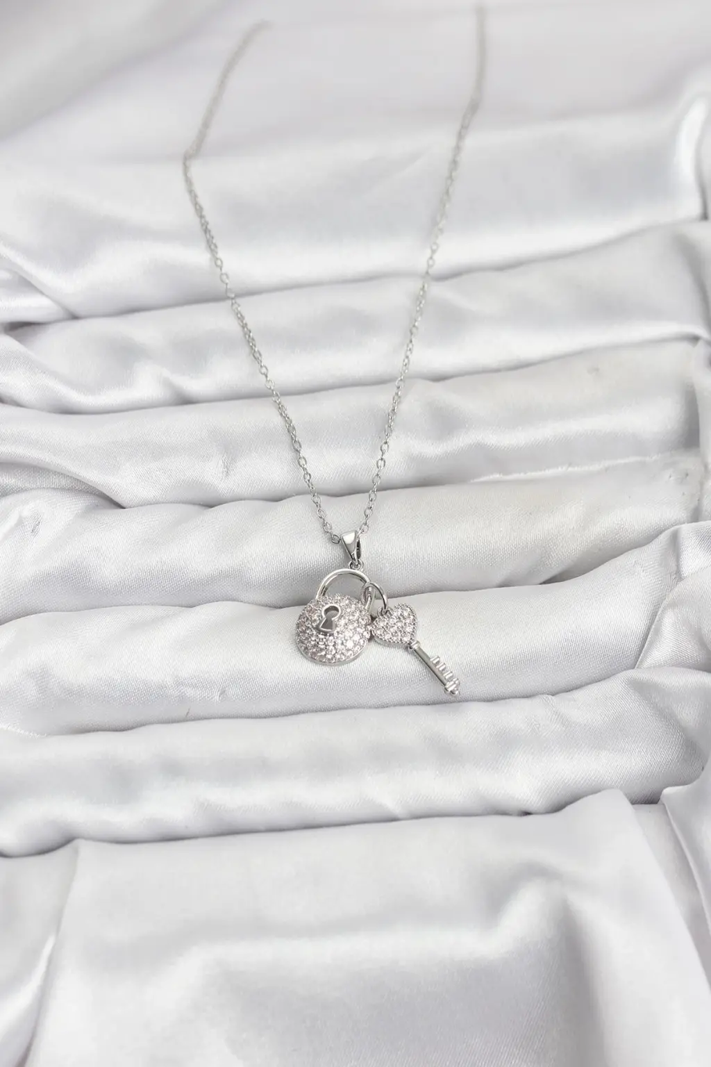 316L Çelik Zincir Gümüş Renk Kilit Anahtar Model Zirkon Taşlı Kadın Kolye Eşşiz tasarımıyla sizlerle. En uygun fiyat garantili kararmaz modelimiz karşınızda.