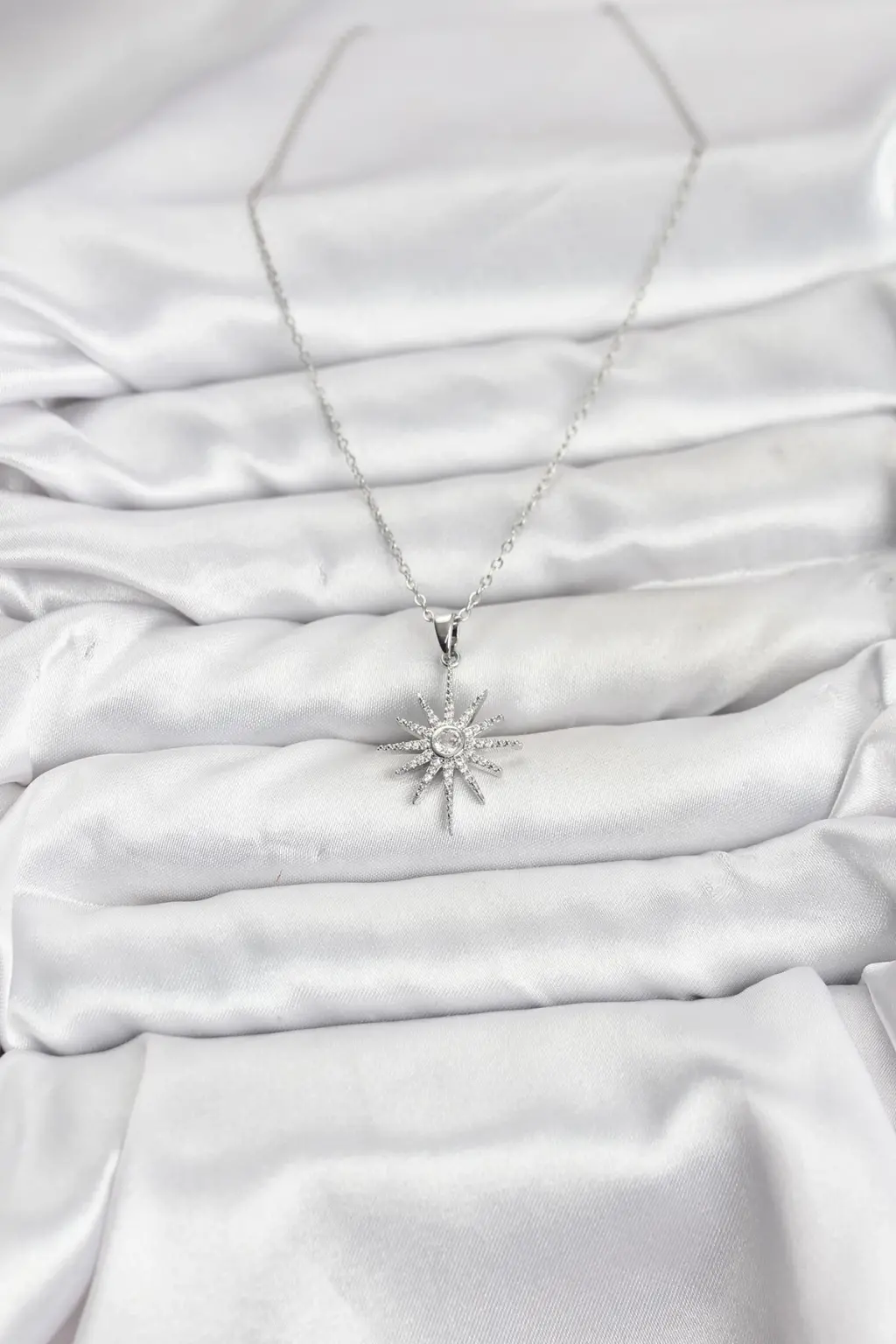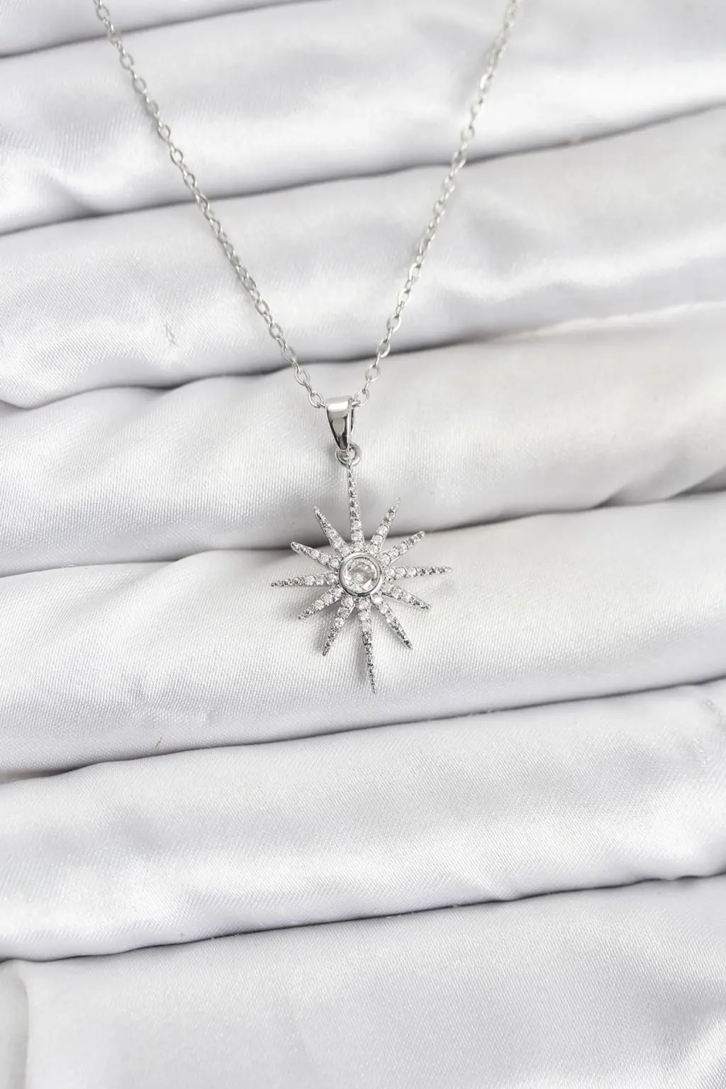 Gümüş rengiyle sade ve şık bir görünüm sunan bu kolye, üzerindeki kutup yıldızı modeli ve zirkon taşlarıyla da fark yaratıyor.