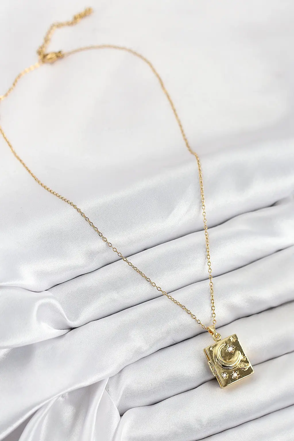 Gleam'in özel tasarımı olan 316L Çelik Zirkon Taşlı Açılabilir Kapaklı Kitap Model Gold Renk Kadın Kolye, şıklık arayan kadınların favorisi olmaya aday!
