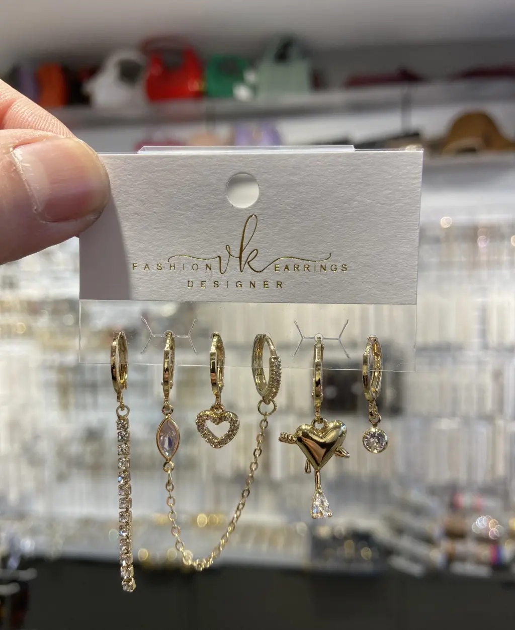 - Set içerisinde kalp motifli, suyolu desenli ve sallantılı küpeler bulunmaktadır.