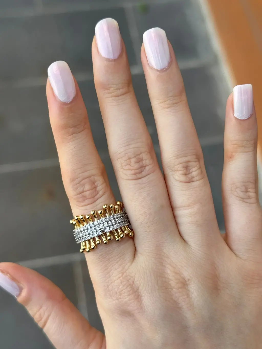 Bu yüzük, hem gündelik kombinlerde zarif bir tamamlayıcı olarak hem de özel davetlerde dikkat çekici bir aksesuar olarak kullanılabilir. Paslanmaz çelik materyal üzerine yapılan altın kaplama sayesinde kararma yapmaz, uzun süre parlaklığını korur.