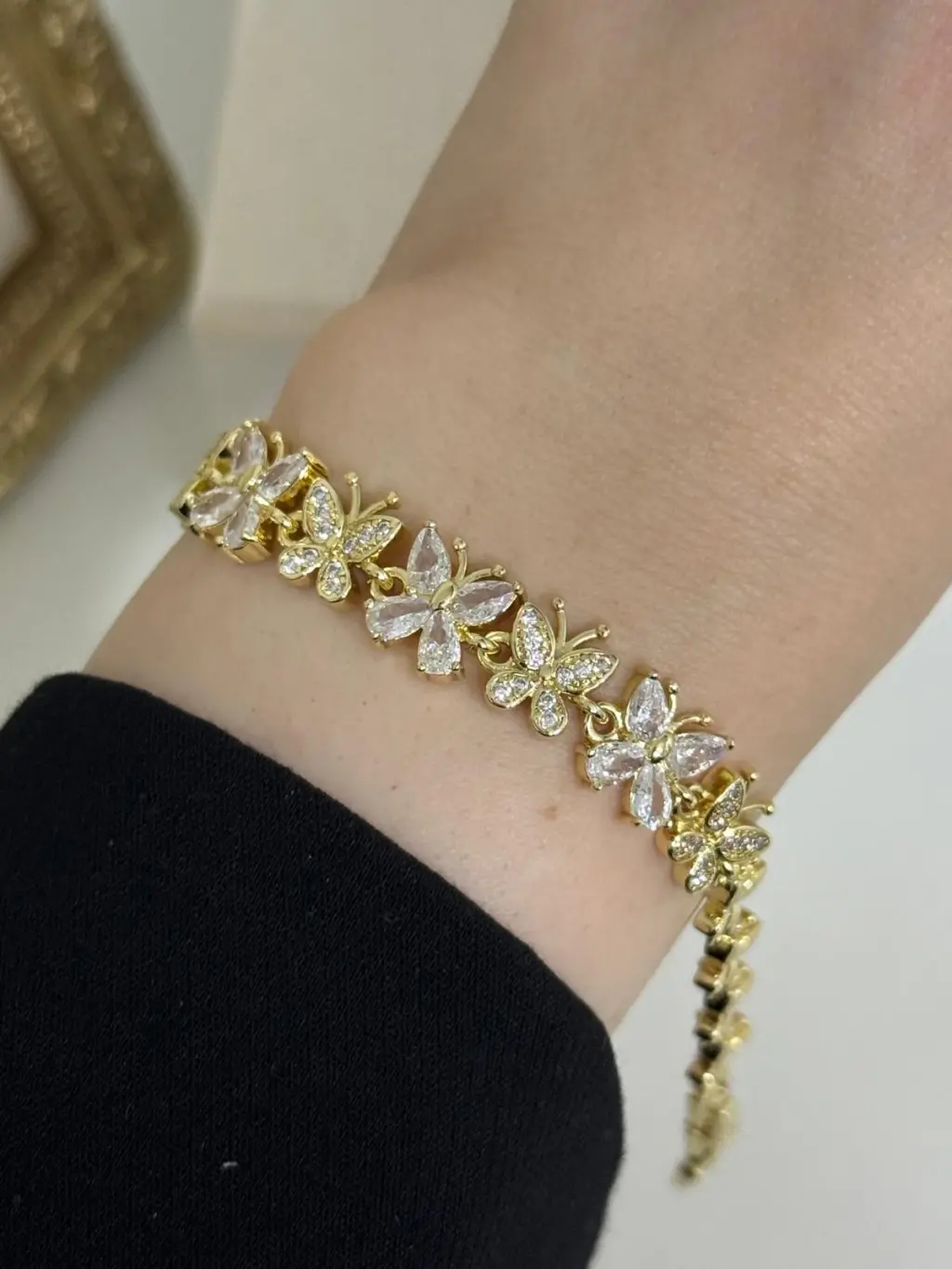 Altın kaplama detaylarıyla şıklığı ve zarafeti bir araya getiren Gleam marka bu bileklik, taşlı kelebek deseniyle dikkat çekici bir görünüme sahip. Dayanıklı çelik malzemeden üretilen bu bileklik, hem günlük kullanıma hem de özel günlerde tercih edebileceğiniz şık bir aksesuar. Kelebek figürü, özgürlüğü ve değişimi simgelerken, taşlar ise ışıltılı bir dokunuş katıyor. Kendinize ya da sevdiklerinize şık ve anlamlı bir hediye alternatifi arıyorsanız, Altın Kaplama Taşlı Kelebek Desenli Çelik Kadın Bileklik tam size göre!