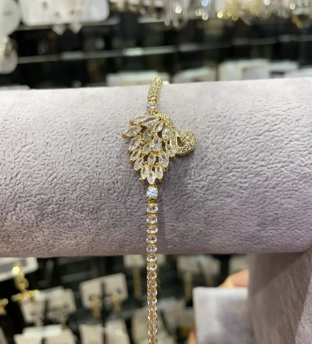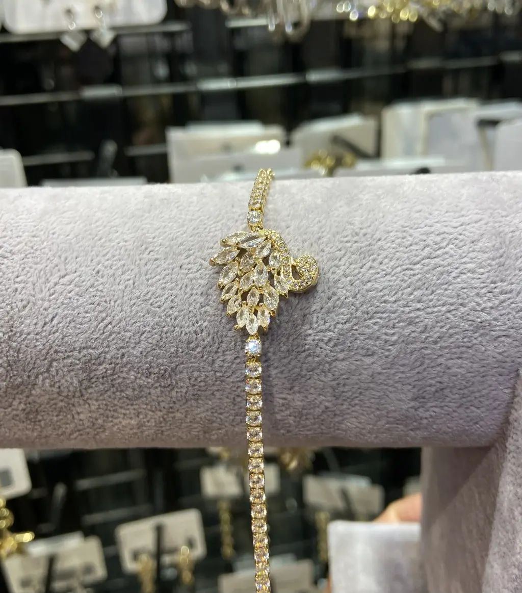 Kuğu bileklik modelleri arasında öne çıkan bu zarif parça, altın rengi detaylarıyla lüks ve asil bir dokunuş sağlar. İnce taşlı zincir tasarımı, bilekte zarif bir şekilde dururken konforlu bir kullanım sunar. Günlük kombinlerde zarif bir parıltı, özel davetlerde ise etkileyici bir tamamlayıcı olarak öne çıkar.