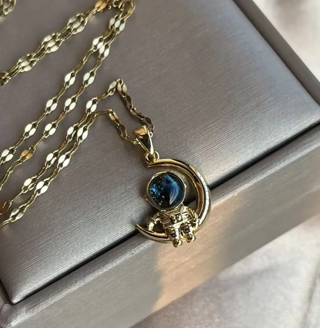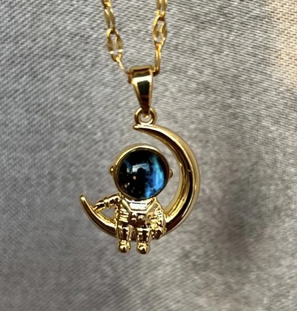Astronot ve Ay Figürlü Altın Renk Kolye – Uzay Temalı Tasarım
