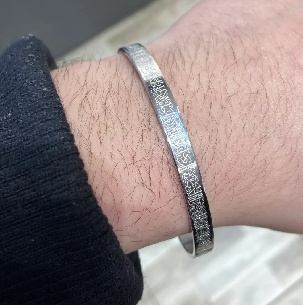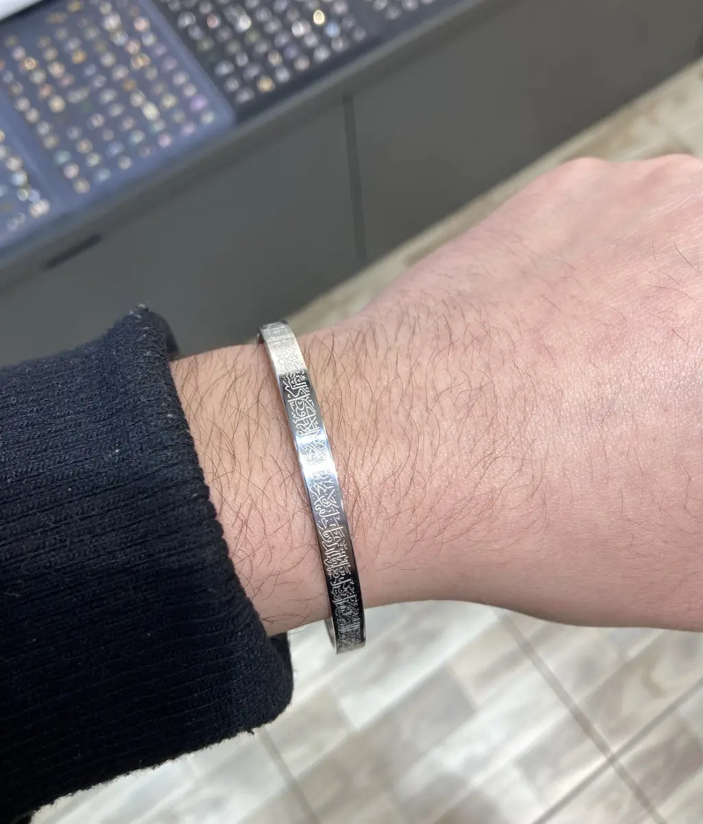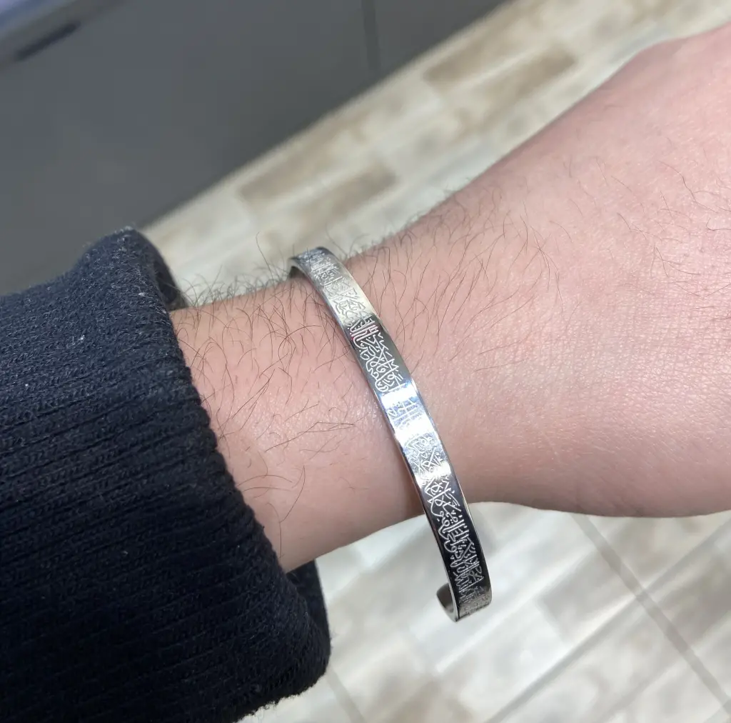 Bu şık bileklik, Ayetel Kürsi'nin Arapça yazılı olduğu özel bir tasarıma sahiptir. Erkekler için tasarlanmış olan bu kelepçe bileklik, hem dini hem de şık bir görünüm sunar. İnce ve dayanıklı çelik malzemeden üretilmiştir.