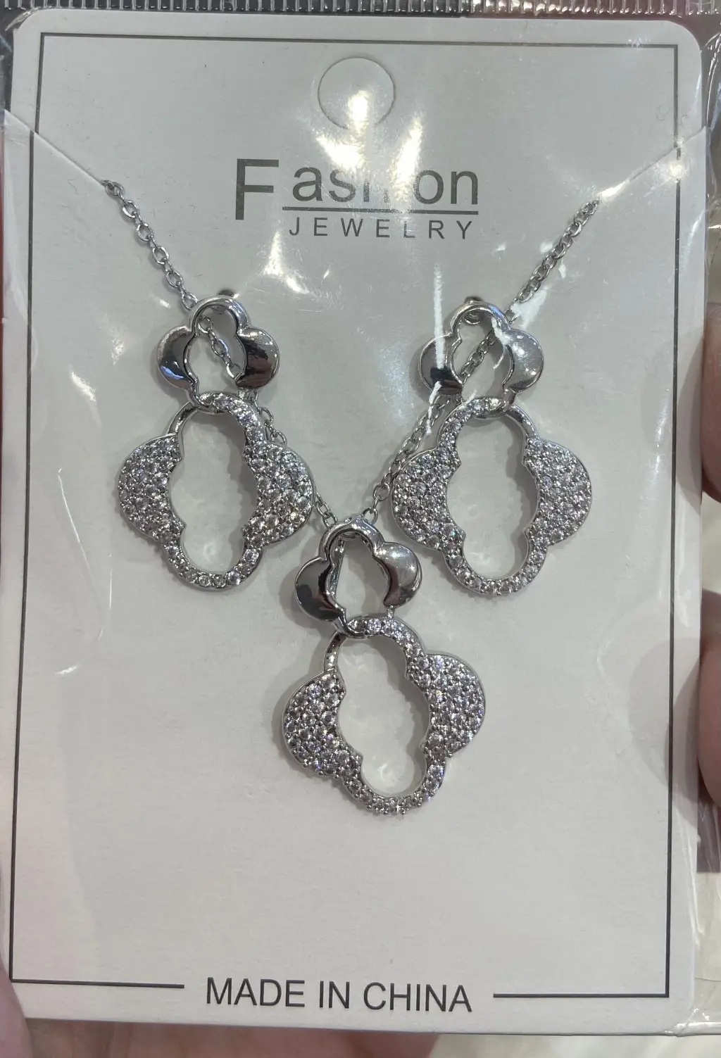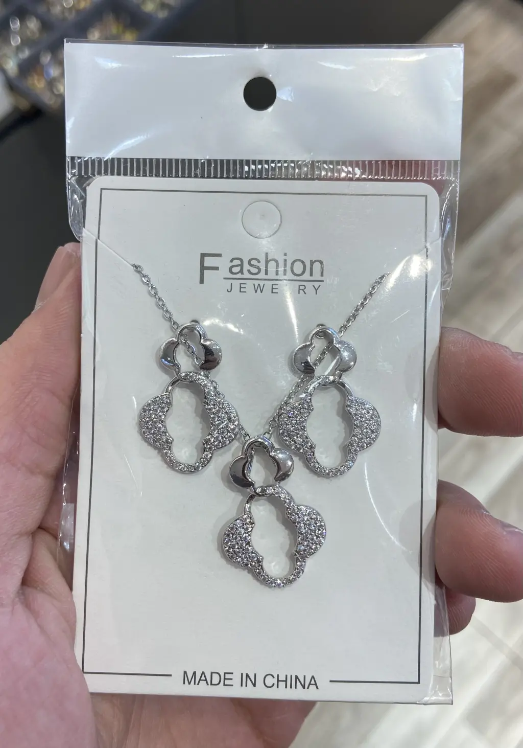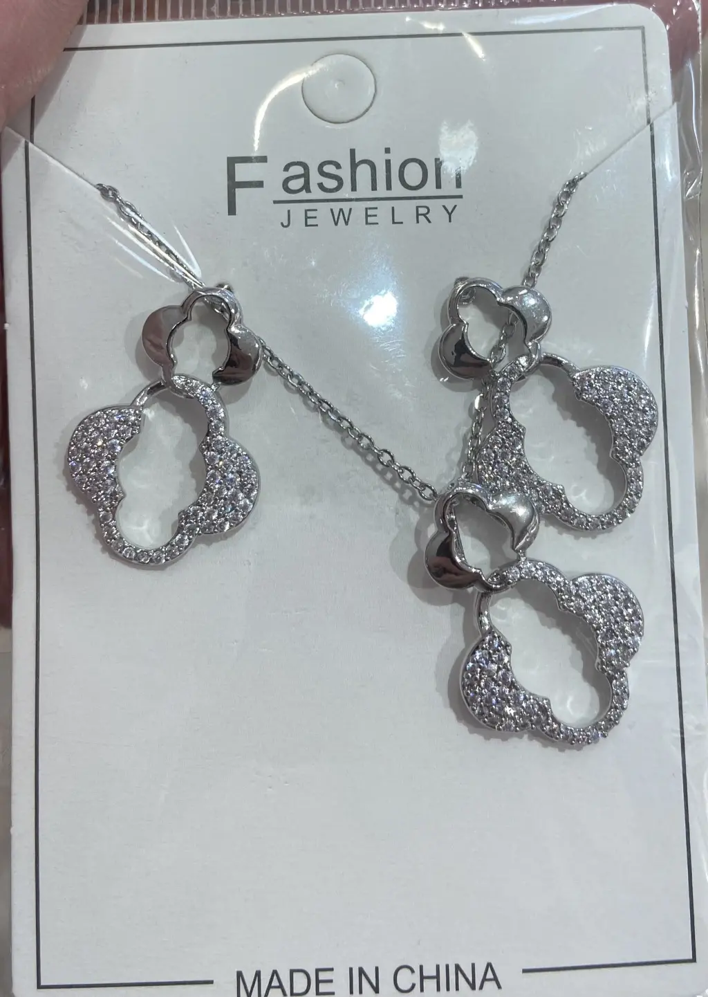 Beyaz Yonca Figürlü Zirkon Taşlı Gümüş Renk Kolye Küpe Takı Seti