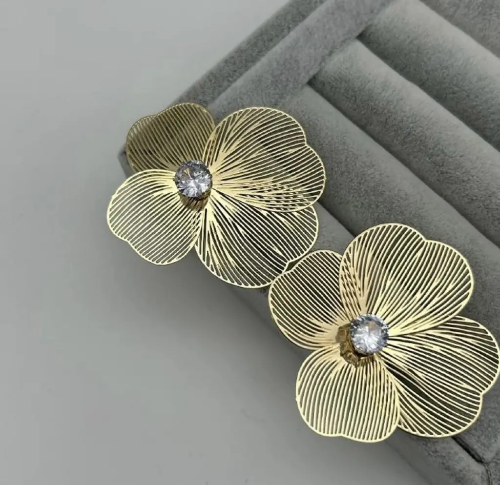 Şık, romantik ve etkileyici tasarımıyla dikkat çeken Büyük Çiçek Modelli Ortası Taşlı Gold Yaprak Küpe, stiline zarafet katmak isteyenlerin takı koleksiyonunda mutlaka yer alması gereken özel bir parçadır.