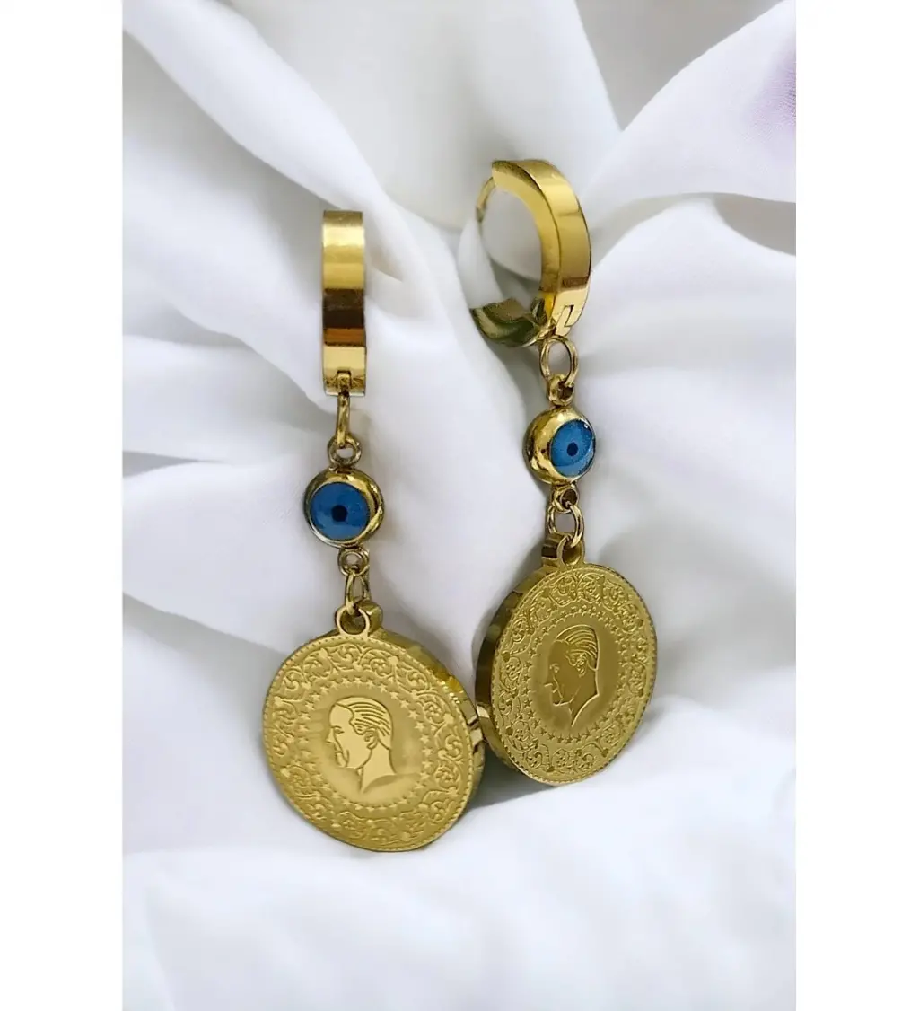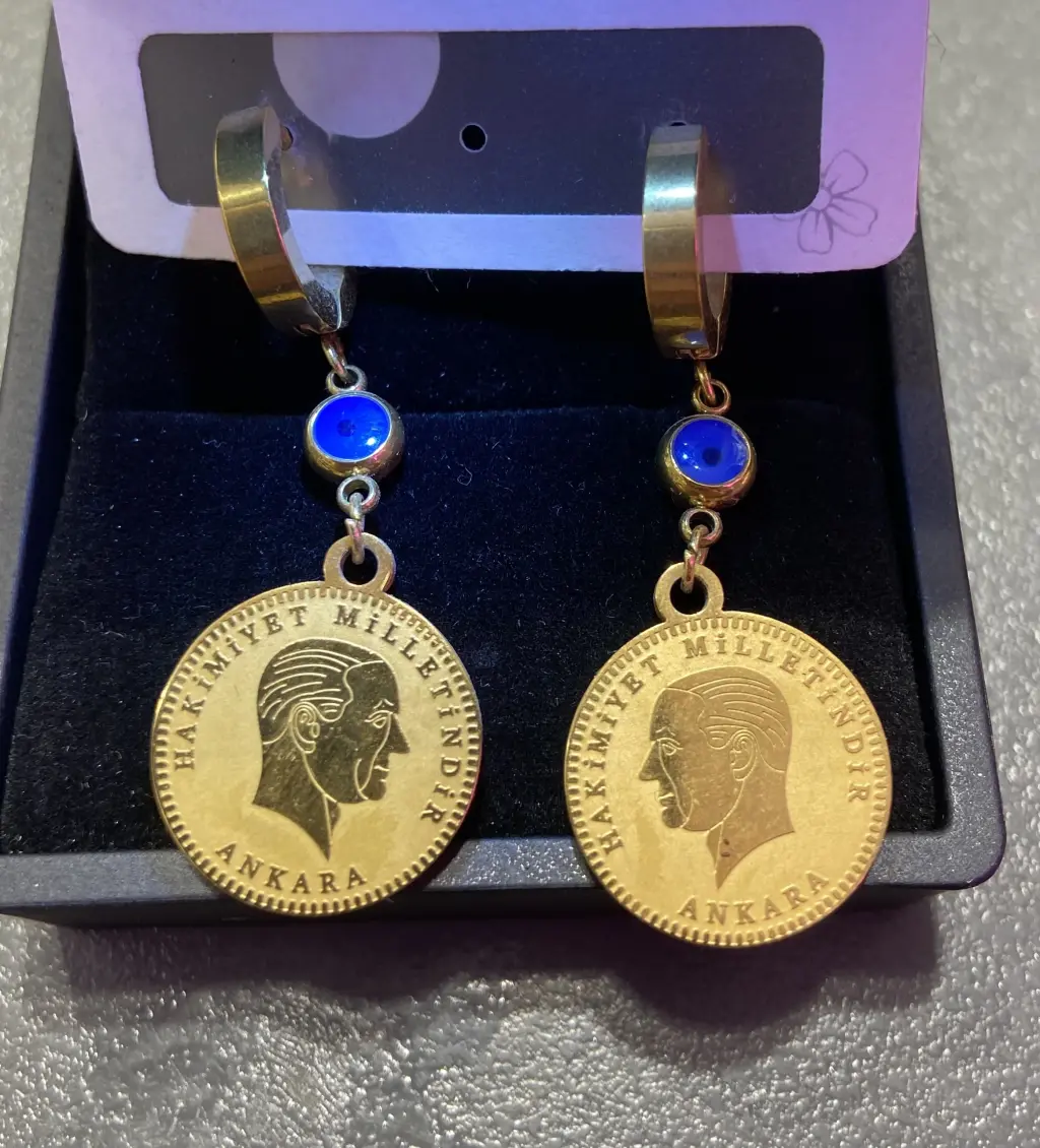 Göz alıcı ve anlamlı detayların bir araya geldiği Çeyrek Altın Şeklinde Nazar Boncuklu Çelik Küpe, hem şık hem de sembolik aksesuarları sevenler için özel olarak tasarlandı. Çeyrek altın görünümündeki zarif metal detay, geleneksel şıklığı modern bir tasarımla buluştururken, ortasında yer alan nazar boncuğu figürü kötü enerjilere karşı koruyucu bir anlam taşır.