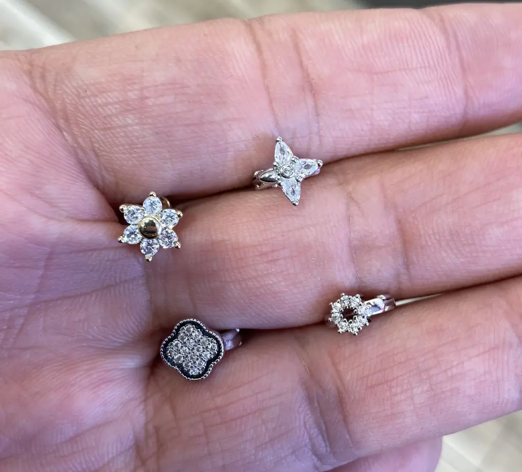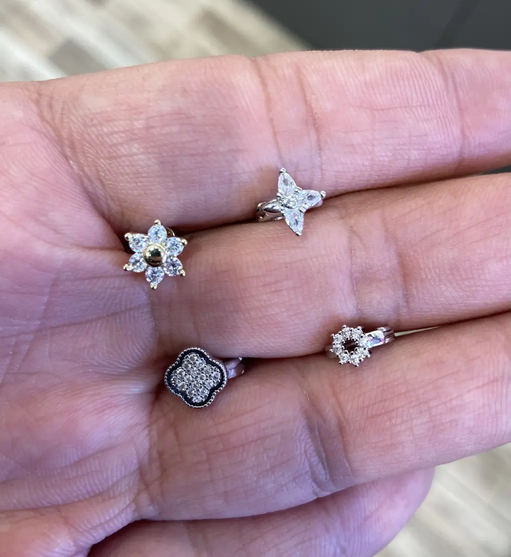 Çiçek Desenli Tragus / Helix Piercing, feminen şıklığı ve zarif ışıltıyı kulağınızın en güzel noktasına taşıyor. Minimal ama etkileyici çiçek motifi, sadelikten gelen estetiğiyle modern takı tutkunlarının vazgeçilmezi olmaya aday.