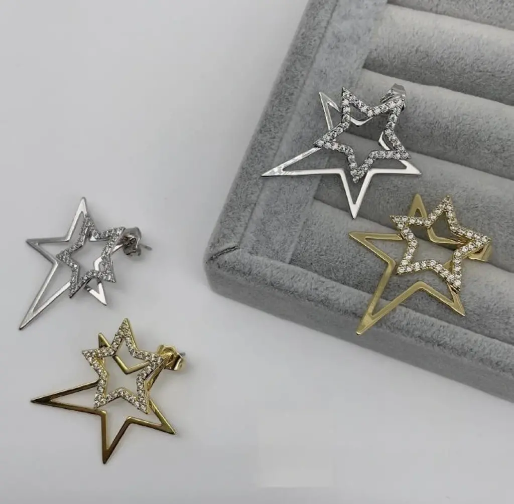 Gökyüzünden ilham alan tasarımıyla dikkat çeken Çift Yıldız Işıltılı Modern Küpe, enerjik ve özgün stilini takılarıyla ifade etmek isteyenler için tasarlandı. Farklı boydaki iki yıldızın iç içe yerleştiği bu sıra dışı model, hareketli ve dinamik duruşuyla hem günlük kombinlere hem de özel davetlere modern bir şıklık katıyor. Üst yıldızı çepeçevre saran zirkon taşlar kusursuz bir parlaklık sunarken, alt yıldızın sade metal formu tasarıma güçlü bir kontrast kazandırıyor.