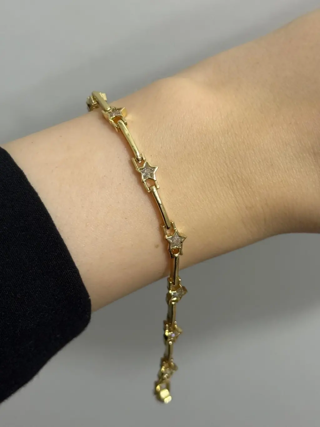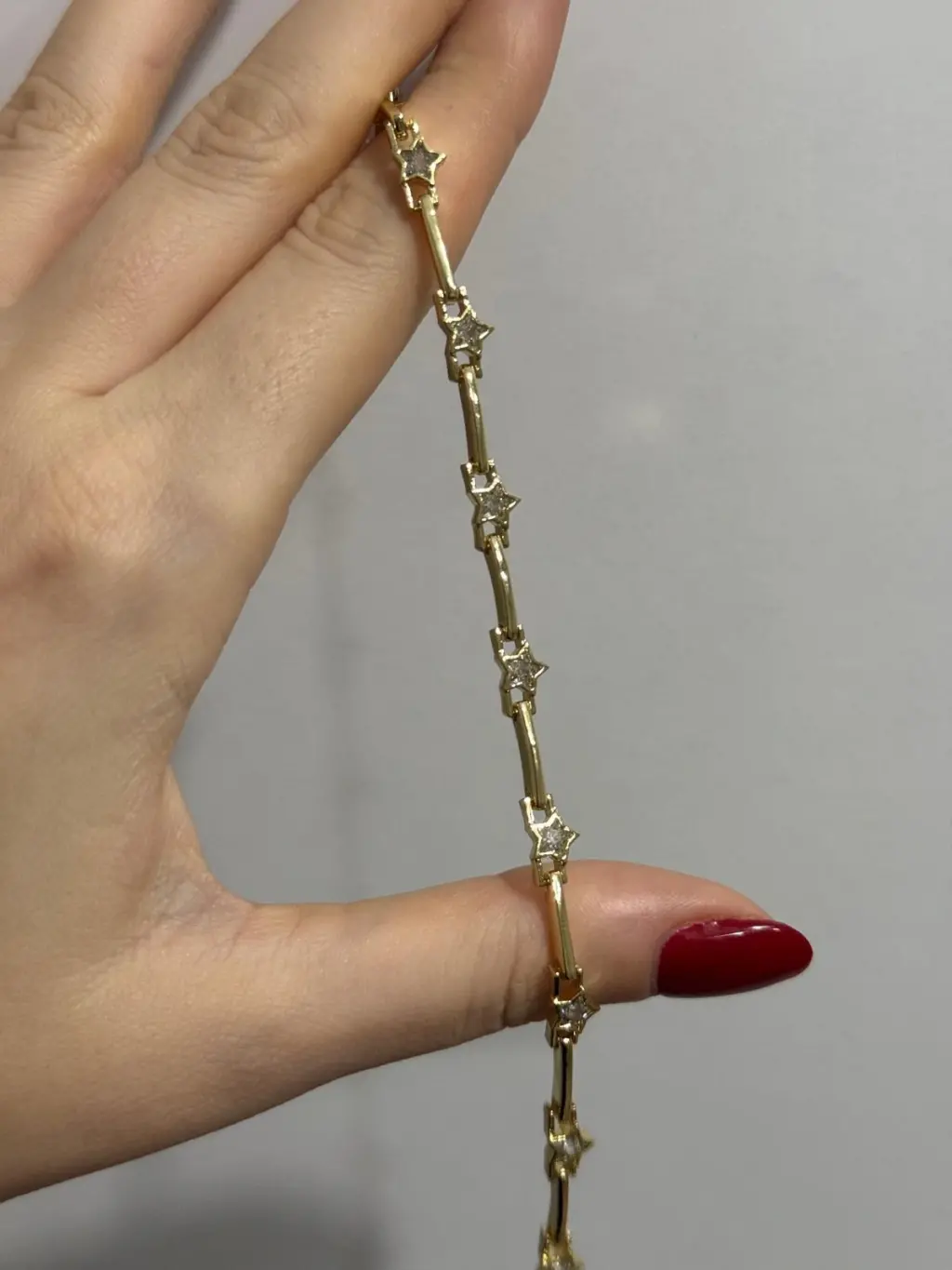 Gold Renk Çoklu Yıldız Motifli Kararmaz Çelik Kadın Bileklik, şıklığı ve zarafeti bir arada sunuyor. İster günlük hayatta ister özel günlerde kullanabileceğiniz bu bileklik, tarzınıza özgü bir parça olacak.