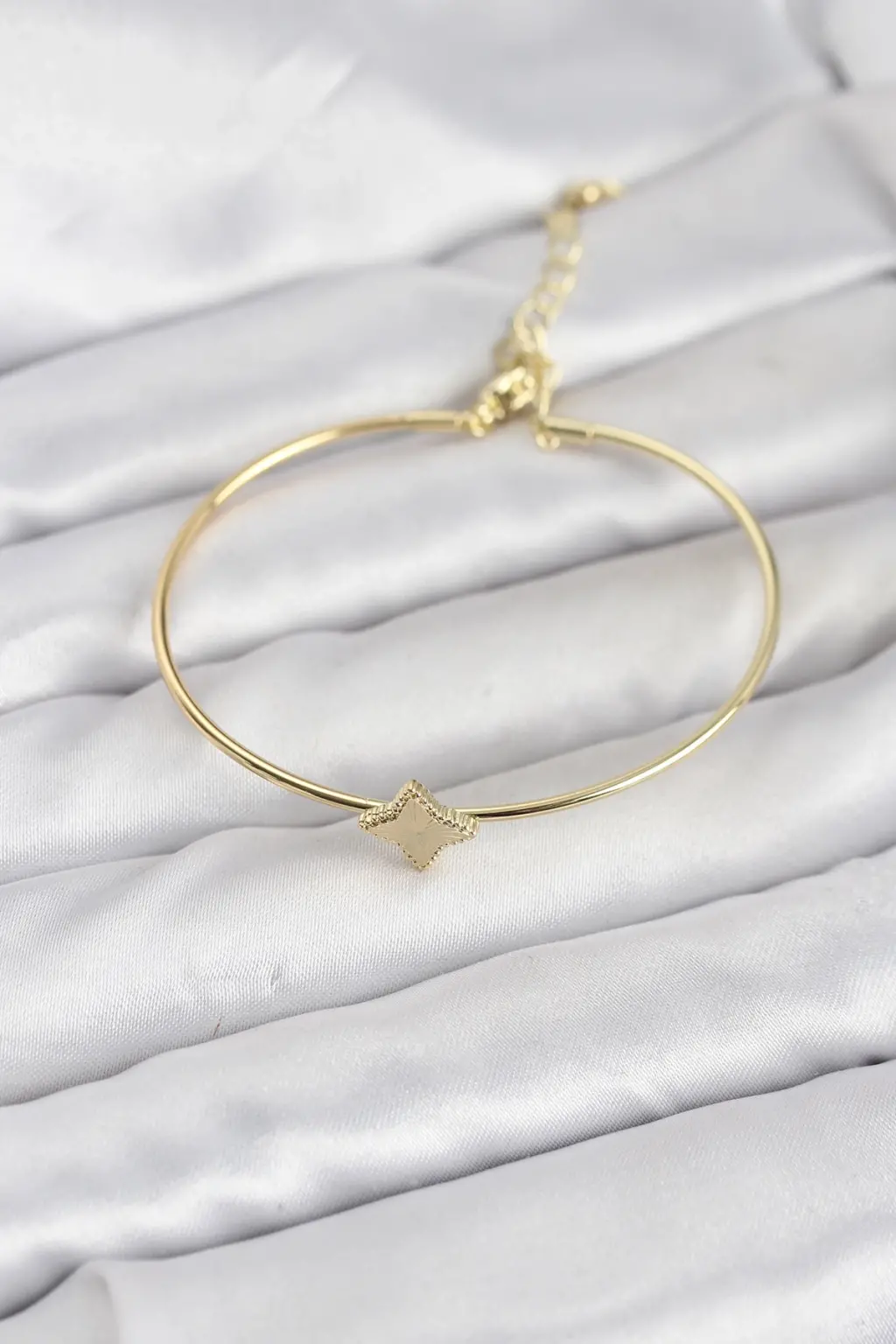 Gleam Gold Renk Pirinç Köşeli Yonca Model Kadın Bileklik, şıklığı ve zarafeti bir arada sunarak kadınların stilini tamamlıyor.