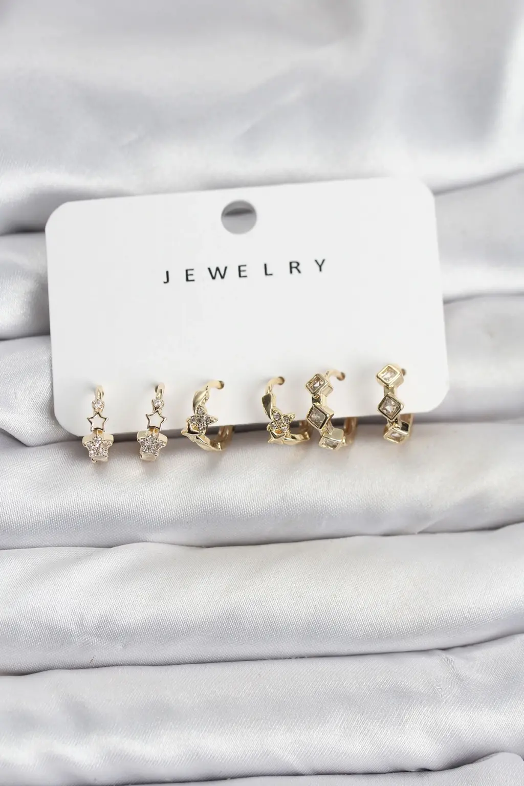 - Set İçeriği: Pirinçten üretilmiş gold renk yıldız modelli halka küpeler