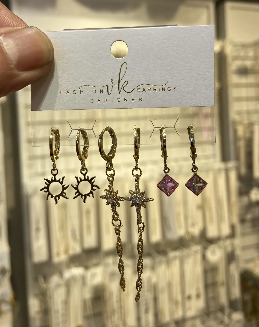 Tarzınıza modern ve göz alıcı bir dokunuş katmak için Gold Sallantılı Kuzey Yıldızı ve Güneş Motifli Halka 6'l Küpe Seti'ni hemen satın alın!