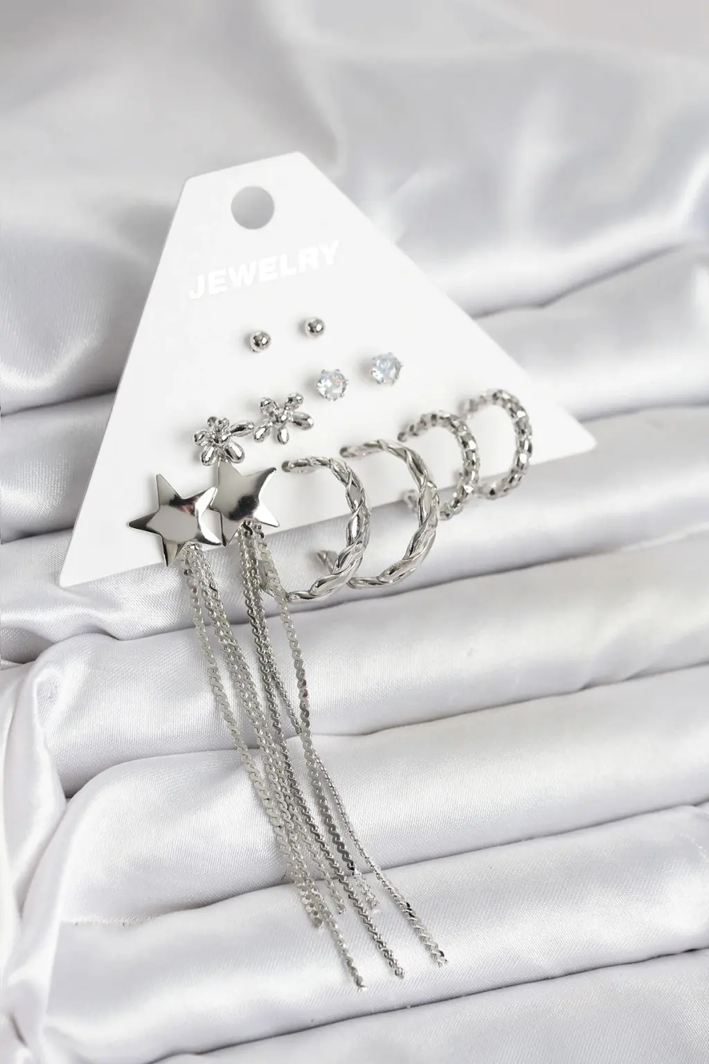 Bu şık ve modern tasarıma sahip Gümüş Renk Sallantılı Yıldız Pirinç 6 Çift Kadın Küpe Seti, günlük kullanımınızda ve özel günlerde stilinizi tamamlamak için ideal bir seçimdir.