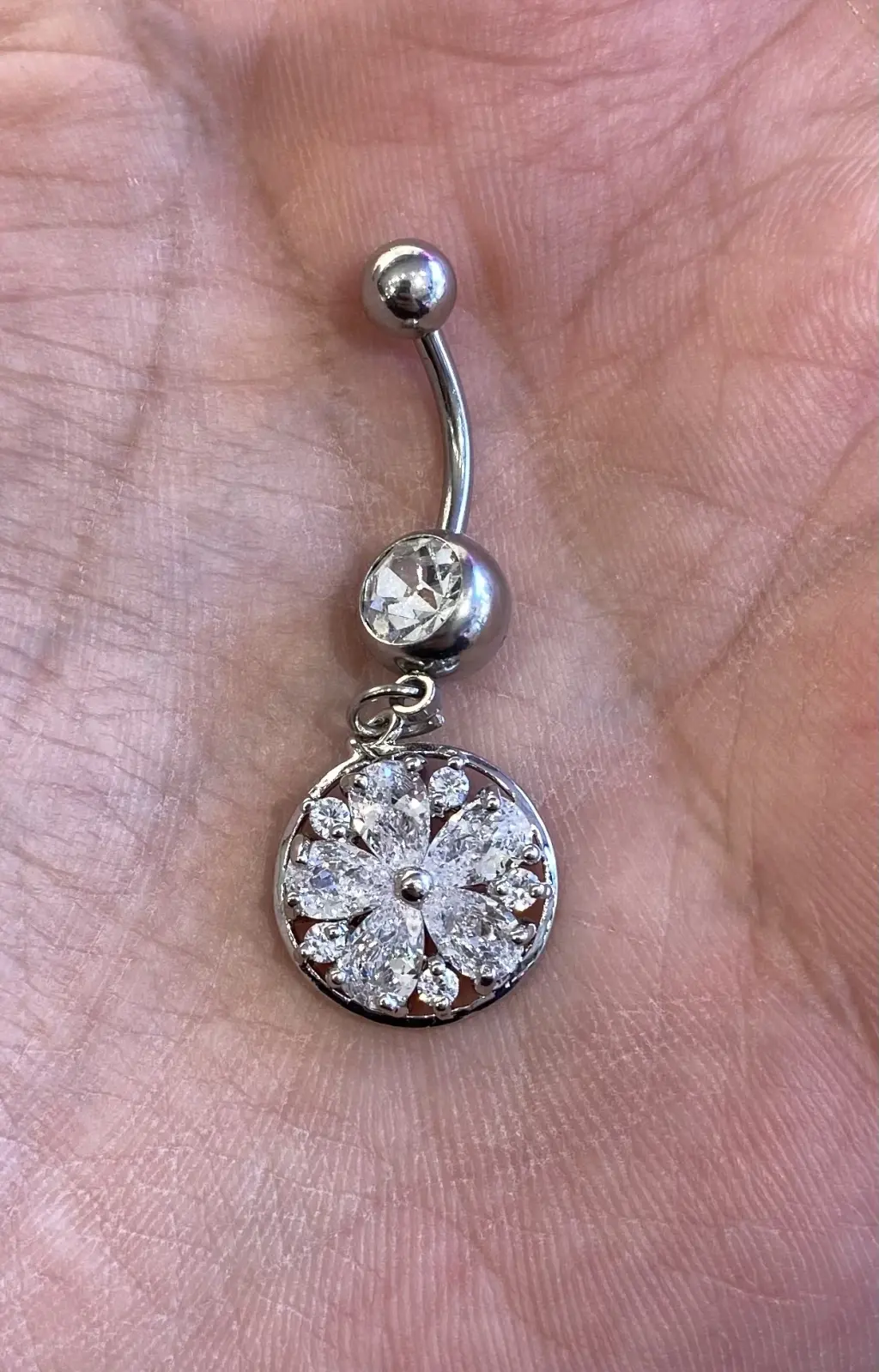 Bu Gümüş Renk Taşlı Çiçek Sallantılı Cerrahi Çelik Göbek Piercing, zarif tasarımı ile dikkat çekiyor. Yüksek kaliteli cerrahi çelikten üretilmiş olup, dayanıklı ve sağlıklı bir seçenektir. Göbeğe asılan sallantılı çiçek detayı, oldukça şık bir görünüm sunmaktadır.