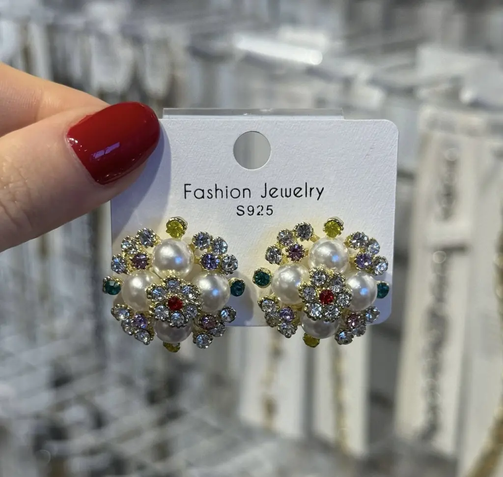 İnci ve Renkli Taşlı Çiçek Form Gold Kararmaz Küpe