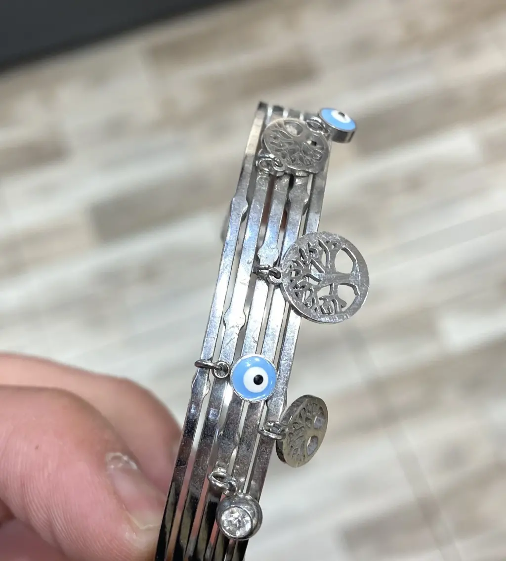 Bazen hayat bize sürprizler yapar, nazar boncuğuna ihtiyaç duyduğumuz anlar gelir. İşte tam da o anlarda Gleam'in kalın gümüş renk kelepçe bileziğiyle kendinizi şımartabilirsiniz. Bu özel bilezik, hayat ağacı ve yaşam çiçeği motifleriyle süslenmiş, üzerinde nazara karşı etkili bir nazar boncuğu bulunduran eşsiz bir tasarıma sahiptir.