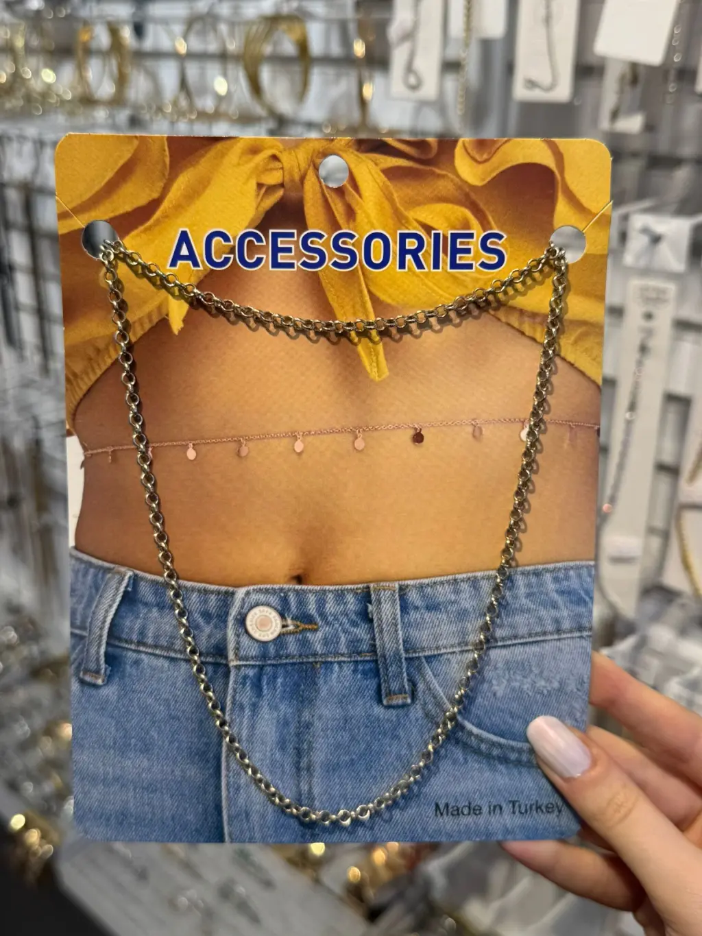 Bu vücut zinciri, sade kombinlere dinamik bir karakter kazandırır. Düşük bel pantolonlar, crop toplar veya bikini üstleriyle kombinlendiğinde feminen ama iddialı bir görünüm oluşturur. Minimal ama etkileyici tasarımıyla gündüzden geceye her stile uyum sağlar.