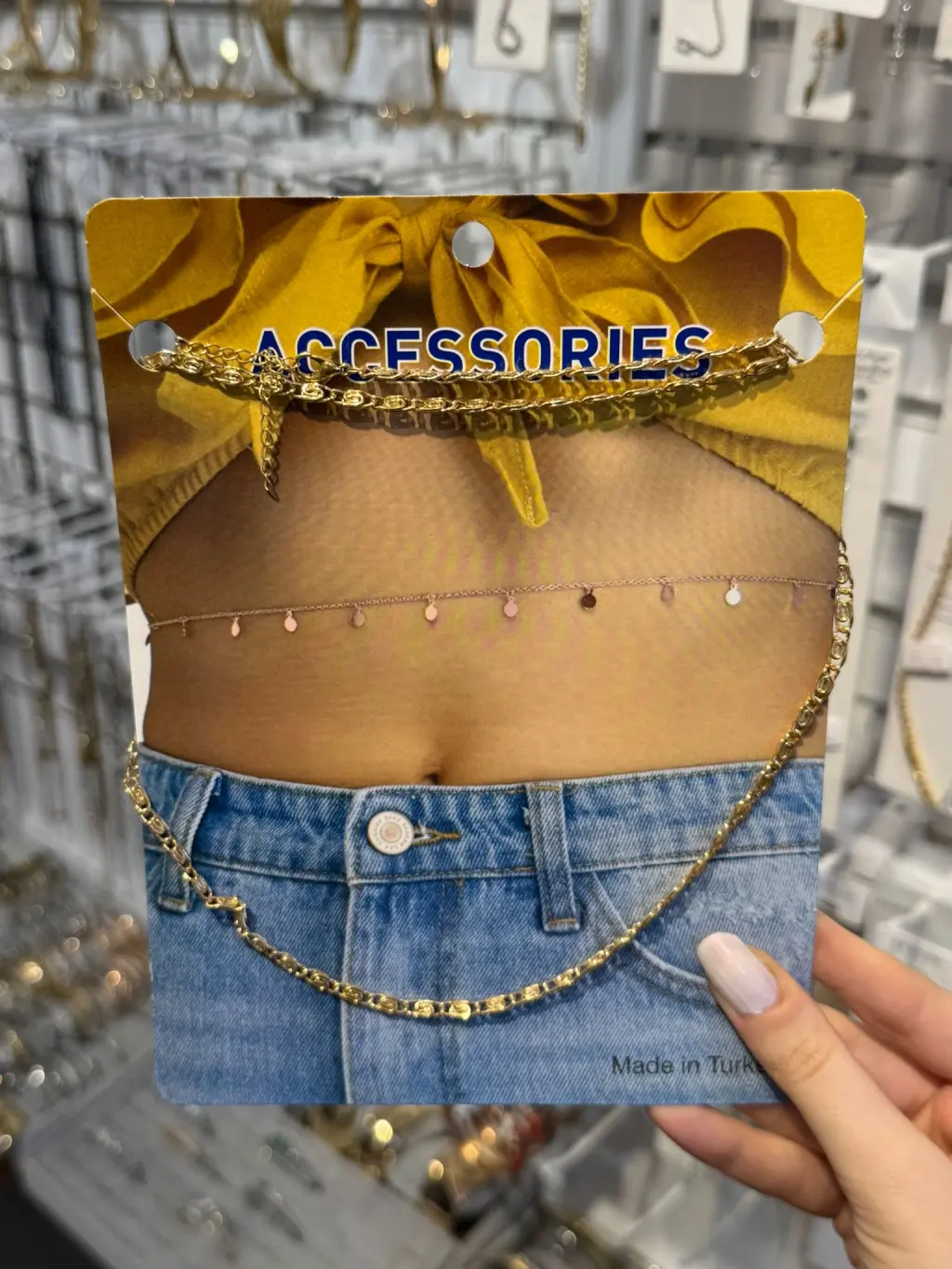 Bu vücut kolyesi, sade kombinleri bir anda şık hale getirirken vücudu zarifçe saran formuyla dikkatleri bel bölgesine çeker. Crop top, düşük bel pantolon veya elbiselerle kombinlendiğinde modern bir dokunuş kazandırır.