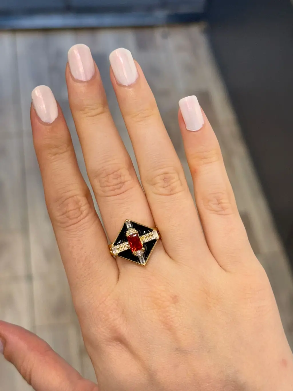 Kırmızı Baget Taşlı Siyah Kare Model Altın Kaplama Yüzük