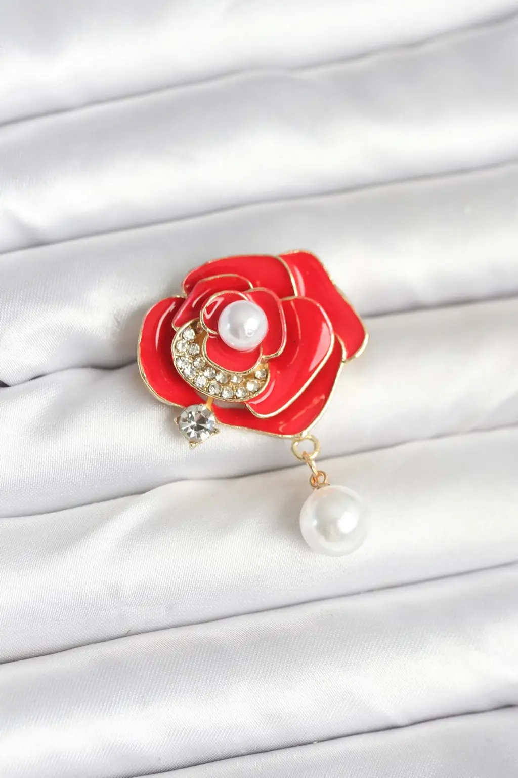 İnci detaylı kırmızı gül broşuyla tarzınıza zarafet katın! Gleam markasının özel tasarımı olan bu broş, her kombini tamamlayacak şık ve şık bir aksesuardır.