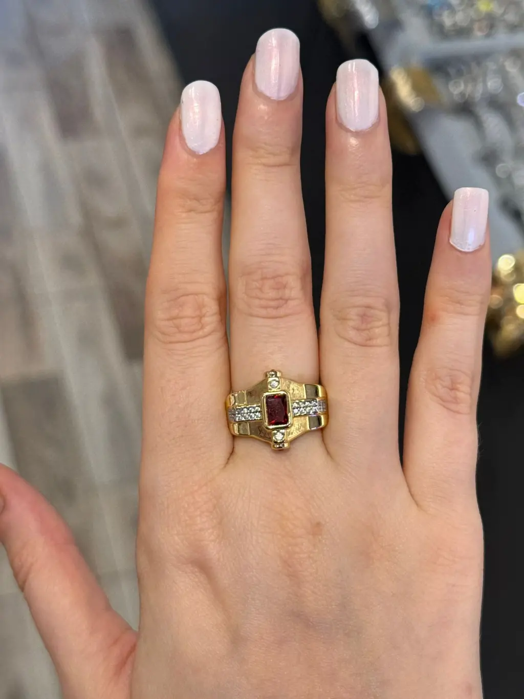 Göz alıcı detaylarıyla öne çıkan bu kadın çelik yüzük, klasik zarafetle modern çizgiyi bir araya getirir. Ortasında yer alan dikdörtgen kesim kırmızı taş, tutku ve gücün simgesi olarak dikkat çeker. Çevresini saran küçük parlak taşlar, yüzüğe ışıltı ve derinlik kazandırırken altın rengin sıcak tonu ile mükemmel bir uyum yakalar.