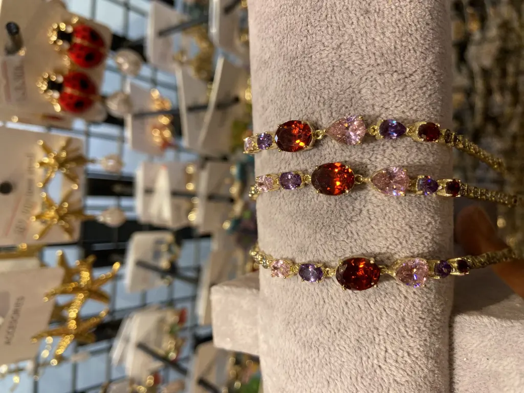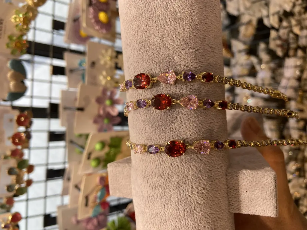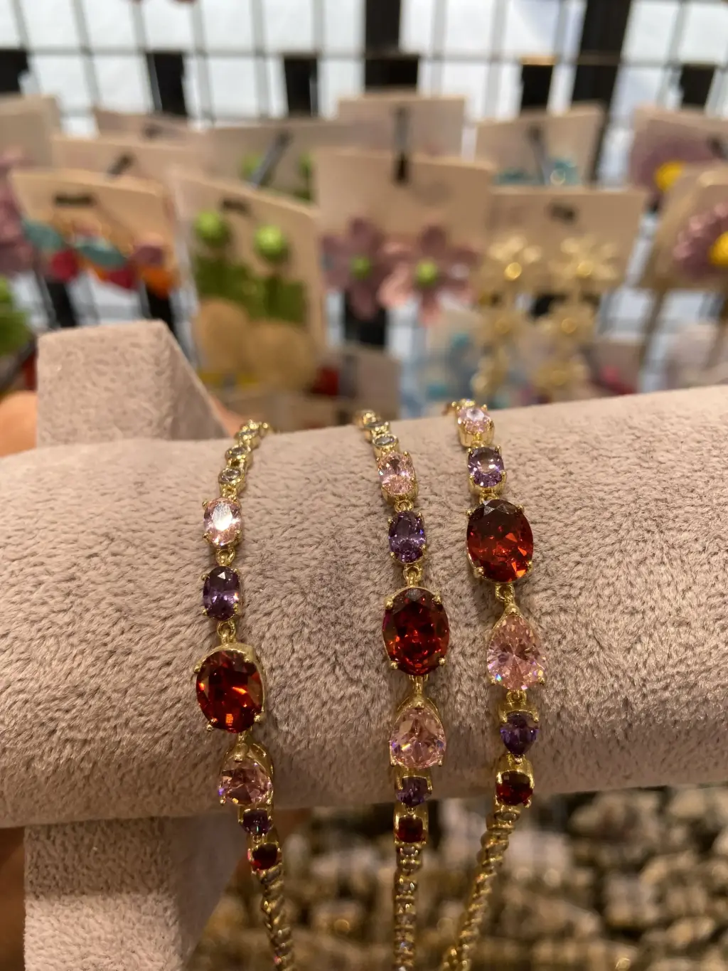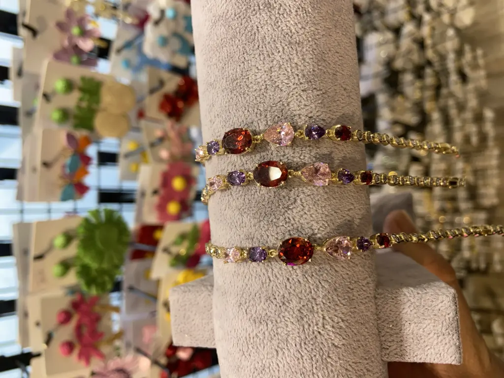Göz alıcı renk uyumuyla dikkat çeken Kırmızı ve Mor Taşlı Altın Renk Su Yolu Kadın Bileklik, zarif ve şık görünümüyle bileğinizde asil bir ışıltı oluşturur. Özenle dizilmiş yuvarlak, oval ve damla kesim taşlar bileklikte ritmik ve zarif bir akış sunarken, altın renkli ayar detayları tasarıma lüks bir dokunuş katmaktadır.