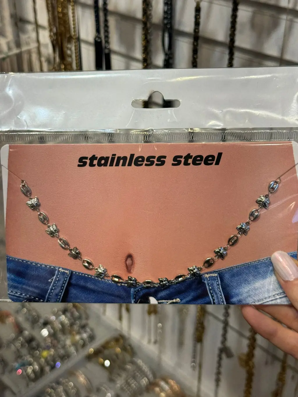 Bu metalik ışıltılı bel zinciri, çiçek motifleriyle hem zarif hem bohem bir görünüm sunar. Paslanmaz çelikten üretilmiş yapısı sayesinde uzun ömürlüdür, suya ve terlemeye karşı dayanıklıdır. Parlak yüzeyi ve dikkat çekici dokusu sayesinde vücudu zarifçe sarar, her stile modern bir dokunuş kazandırır.