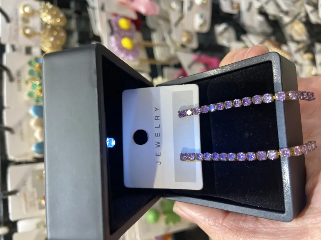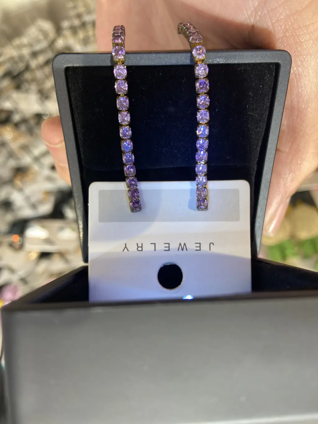Gold detay üzerine dizilmiş yuvarlak kesim mor taşlar, ışıkla buluştuğunda göz kamaştırıcı bir ışıltı oluşturur. Hafif ve konforlu yapısı sayesinde gün boyu rahatlıkla kullanılabilir. Minimal tasarımıyla tek başına zarif görünürken, dilerseniz diğer aksesuarlarınızla da kolayca kombinlenir.