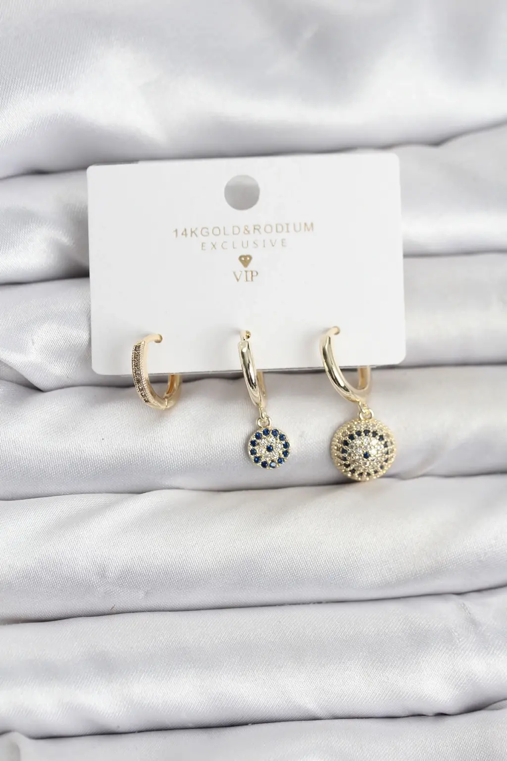 Nazar Model Gold Renk Pirinç 3'lü Kadın Küpe Seti özel tasarım