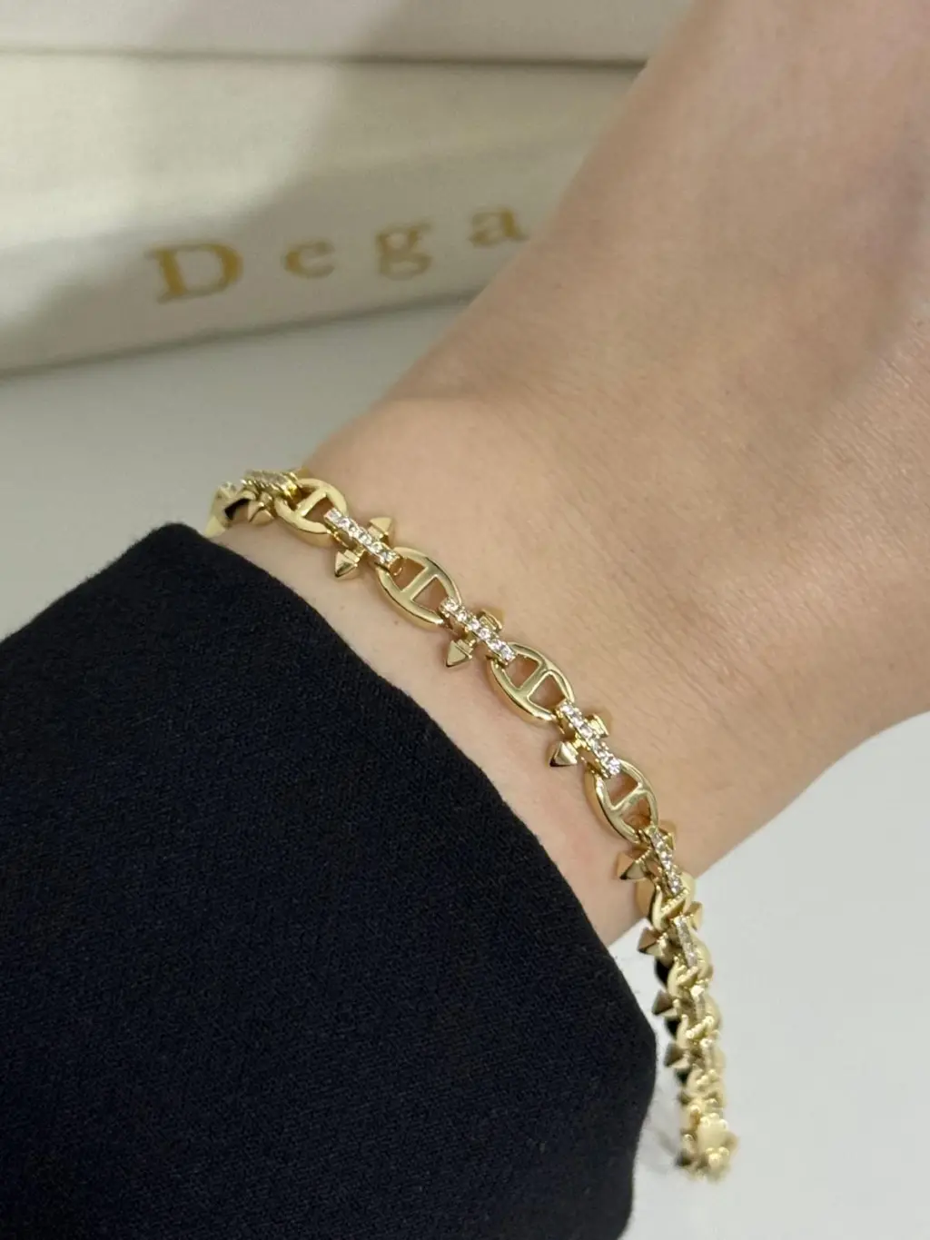 Şıklık ve zarafetin bir araya geldiği Gleam Ok Detaylı İç İçe Geçmiş Zincir Model Kararmaz Stainless Steel Kadın Bileklik, her kombini tamamlayacak şık bir aksesuar seçeneği sunuyor. İnce işçiliği ile dikkat çeken bu bileklik, gün boyu rahatlıkla kullanabileceğiniz dayanıklı bir yapıya sahiptir.