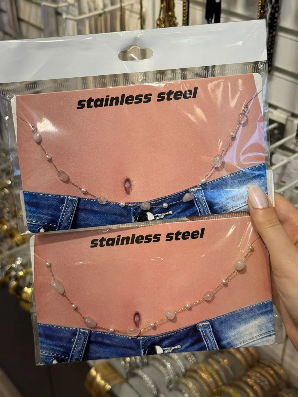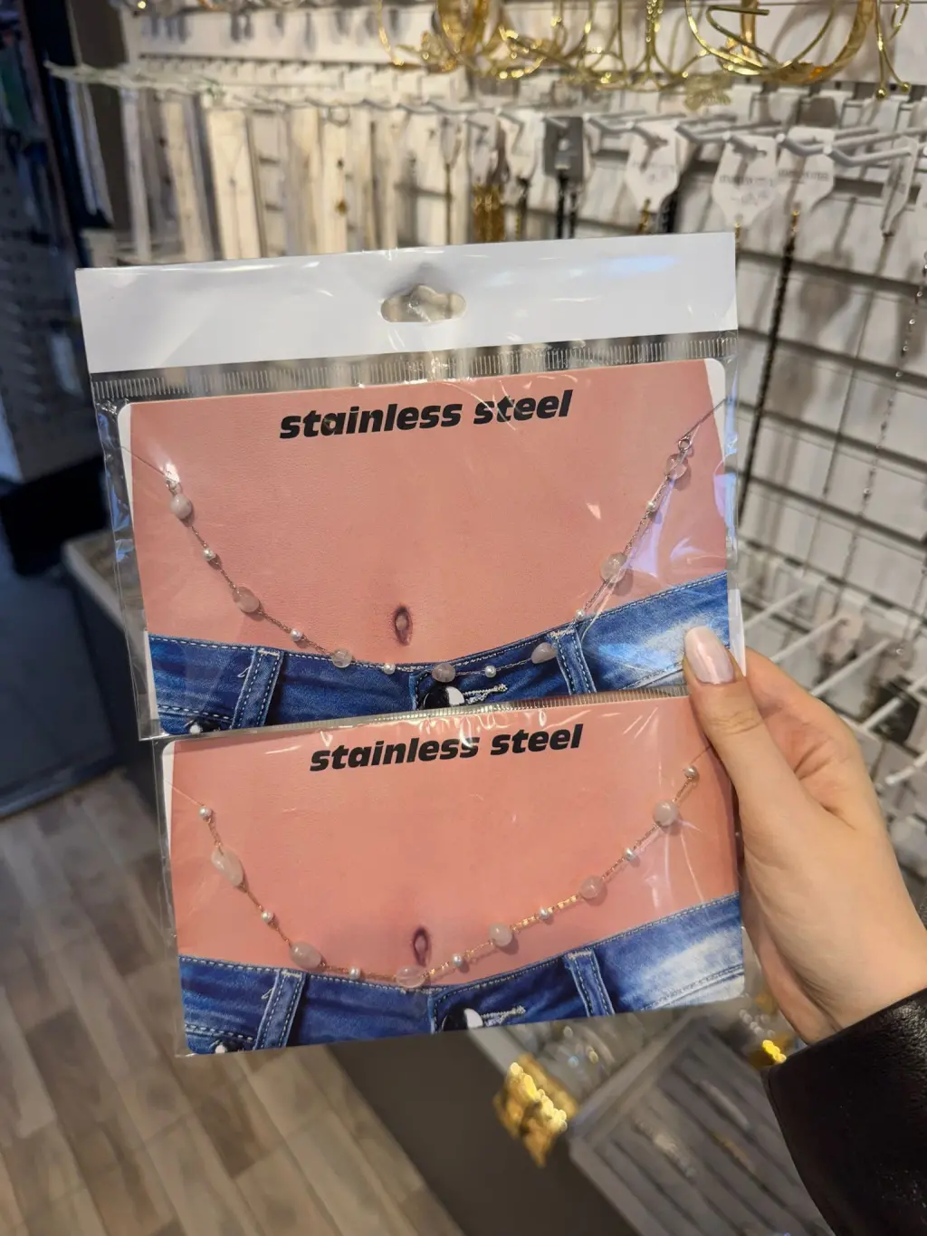 Zarif pembe taş detaylarıyla tasarlanan bu romantik göbek zinciri, feminen ve yumuşak bir ışıltı sunarak tarzına zarafet katıyor. Paslanmaz çelikten üretilen zinciri, suya ve terlemeye karşı dayanıklı olup uzun süre parlaklığını korur. Şeffaf ve pastel tonlu taşlar, vücudu zarifçe saran yapısıyla hem sade hem de dikkat çekici bir görünüm yaratır.