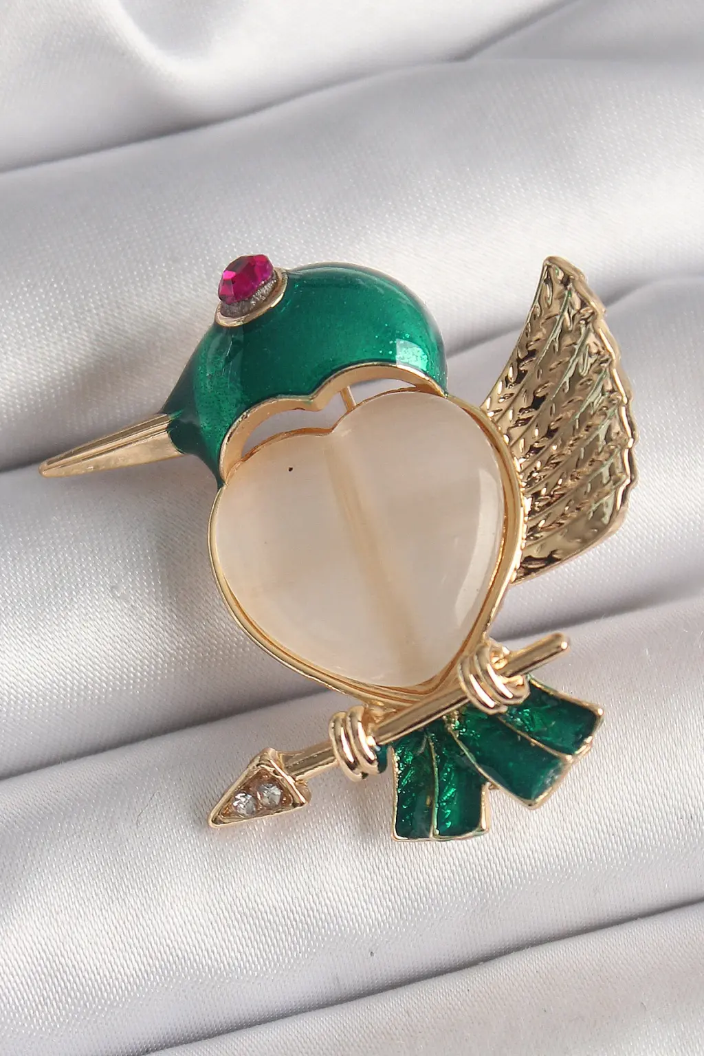Pirinç Gold Renk Beyaz Mineli Kalp Yeşil Sinek Kuşu Model Pembe Zirkon Taş Detay Kadın Broş özel tasarım