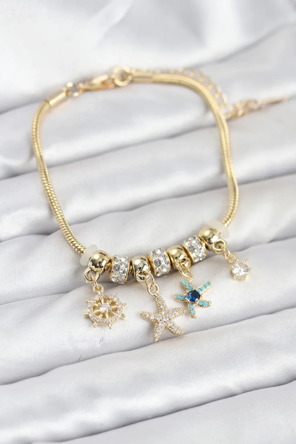 Çelik Gold Renk Deniz Tema Charmlı Kadın Bileklik Zarif detaylarla, göz alıcı tasarımlarla bezenmiş özel tasarım