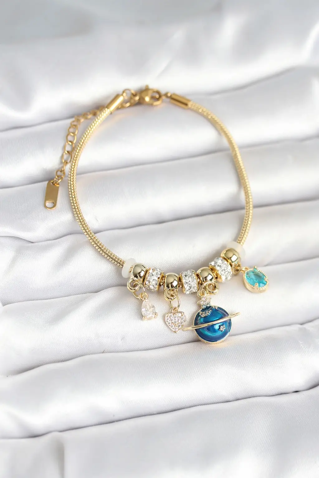 Pirinç Gold Renk Dünya Charmlı Kadın Bileklik Zarif detaylarla, göz alıcı tasarımlarla bezenmiş özel tasarım