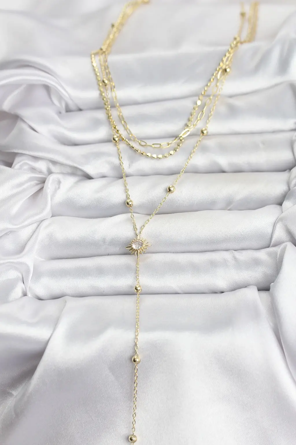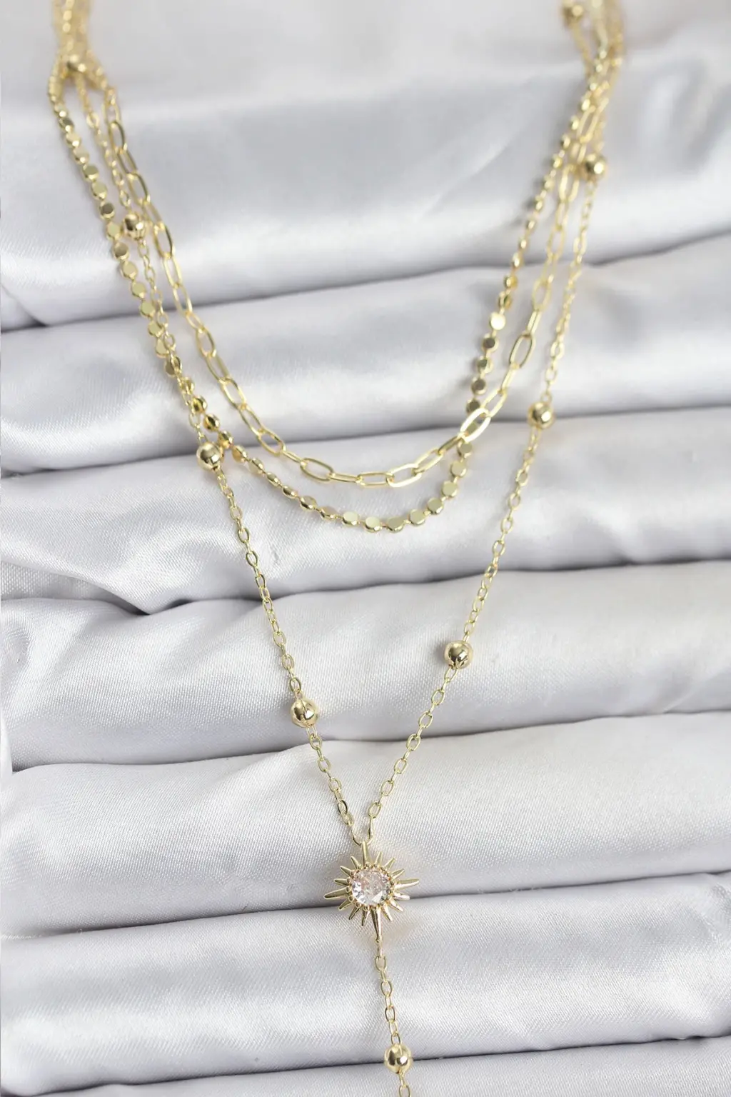 Pirinç Gold Renk Güneş Model Detaylı 3'lü Kombin Y Kadın Kolye, Gleam markasının zarif ve göz alıcı tasarımıyla öne çıkıyor. Bu özel kolye, zarafetinizi ve şıklığınızı tamamlayacak mükemmel bir seçenektir.