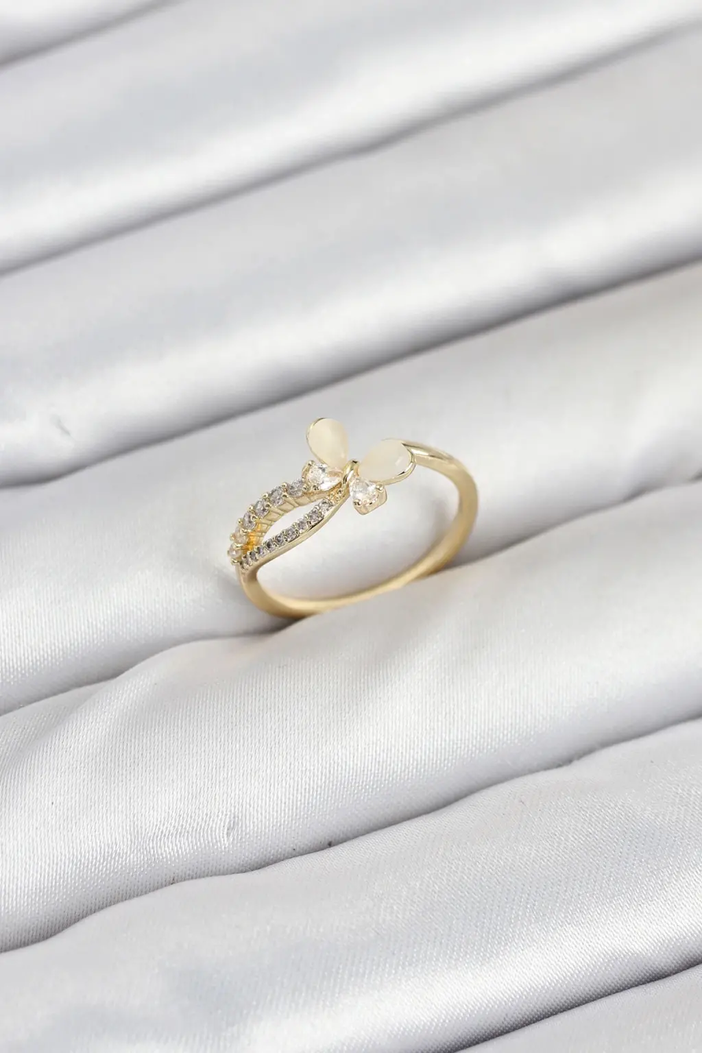Yüzüğün üzerinde bulunan kelebek figürü, etkileyici zirkon taşlarla süslenmiştir.